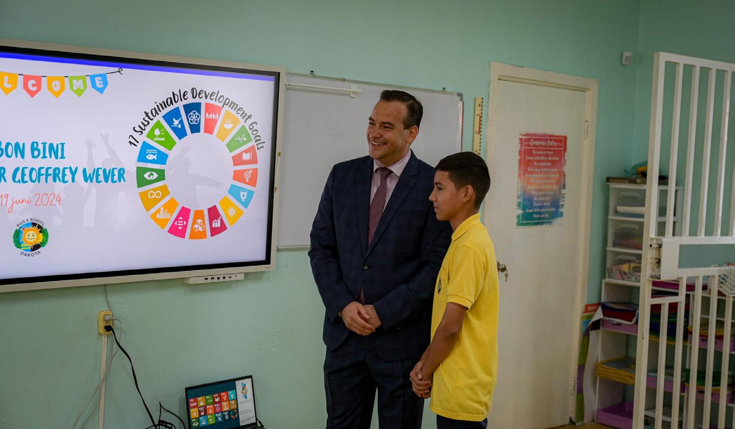 Den cuadro di e proyecto di Minister Geoffrey Wever di presentacion di e metanan di desaroyo sostenibel, e ‘Sustainable Development Goals (SDGs)’, na alumnonan di 6e klas di scolnan basico, e biaha aki a bishita klassen 6 di Pius X School. Henter e scol Pius X a sali pa ricibi y bon bini Minister Wever.