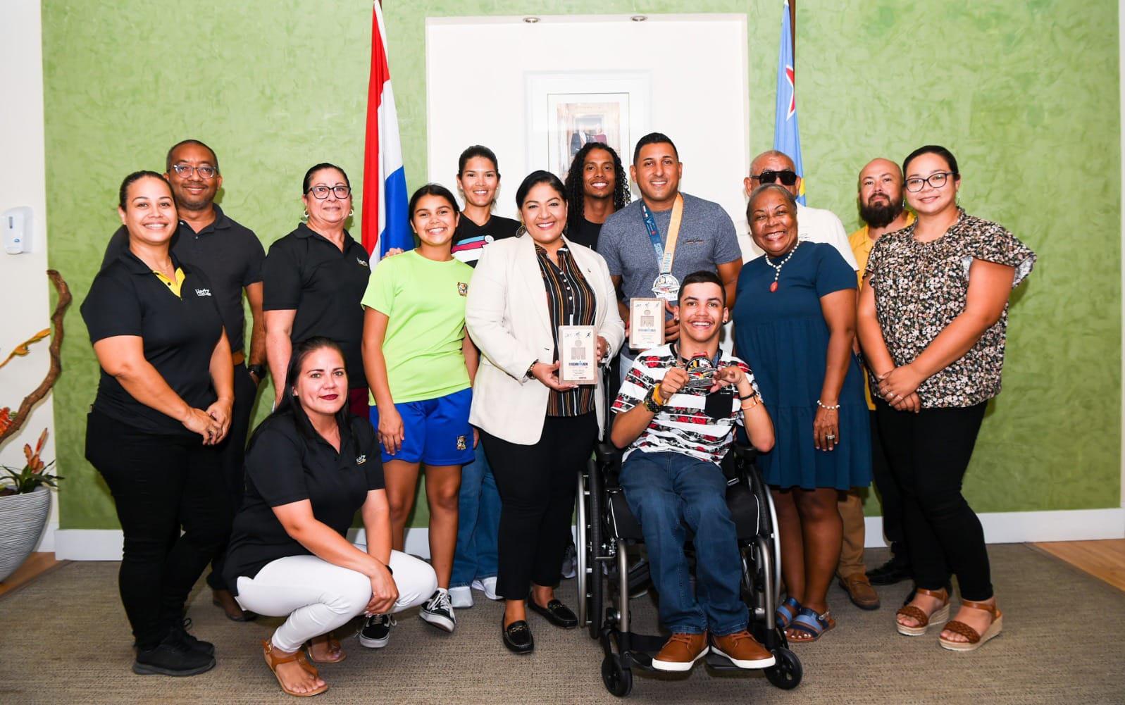 Recientemente, Minister Xiomara Maduro a representa Minister di Deporte Endy Croes y Gobierno di Aruba pa ricibi e ekipo dinamico Disjonrick Jacobs, Brainer Lampe, Gerald Moreta y team na Aeropuerto Internacional Reina Beatrix na nan yegada. Brainer Lampe, Disjonrick Jacobs y Gerald Moreta a participa na e 140.6 (226.3 km) Ironman Maryland 2023 na Merca. Cu tempo registra di 14 ora, 40 minuut y 58 seconde a bira e “fastest track record” di e Ironman na Maryland y Brainer, Disjonrick, Gerald Moreta y Beyond Sports Limit Foundation Aruba a ricibi a Award Physically Challenged/ Intellectual Disability Open Division.