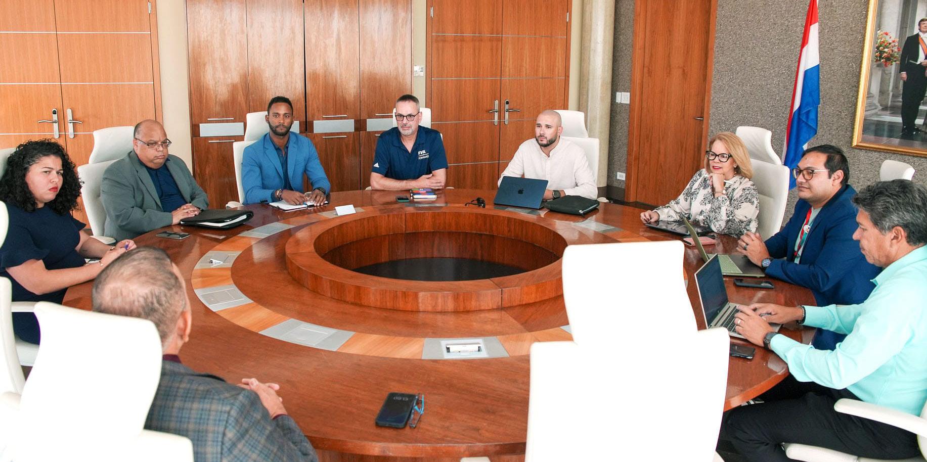 Presente pa e reunion tawata Minister di Deporte, señor Endy Croes, Artificial Turf expert di FIFA, señor Alastair Cox hunto cu FIFA Regional Development Manager, señor Jordan Victoire y representantenan di AVB (Arubaanse Voetbal Bond), consistendo di e Presidente señor Randolf Lacle, Secretario General, señora Dyane Wiersma y Project Manager, señor Pancho Croes.