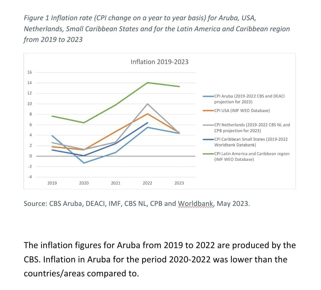 Pa aña 2023 DEACI a calcula basa riba nan modelo macroeconomico MARUBA, cu Aruba lo conoce un inflacion di 4.4%, cu ta un cifra cu tambe ta keda leu di un situacion di hyperinflacion. Ta un inflacion cu ta menos cu esun den aña 2022 y ta basa riba e desaroyo di prijsnan riba mercado internacional, particularmente na Merca y Hulanda, na unda Aruba ta importa mayoria producto. Den aña 2023 Aruba ta concoce un subida di BBO di 1% y e cambio fiscal aki tambe tin su efecto inflatorio. Asina mes, DEACI ta premira un inflacion di 4.4% na Aruba y IMF ta proyecta un inflacion di 3.8% pa Aruba manera publica den e World Economic Outlook di April 2023. Tur dos ta pronosticonan di inflacion pa Aruba cu ta keda leu di locual ta cifranan cu ta mustra riba hiperinflacion.