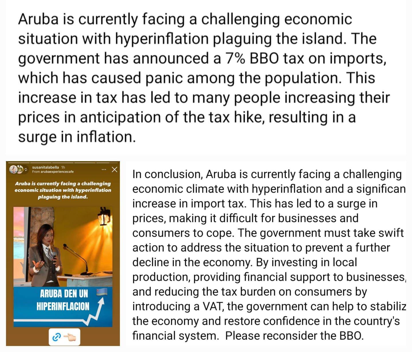 un situacion di hiperinflacion. Si tuma como ehempel Hulanda, cu ta un Pais cu tur hende ta mira como ehempel, e inflacion tabata tur e tempo eynan mas halto cu na Aruba. Cu e cifranan aki compila pa DEACI, Oficina di Estadistica di Aruba y Hulanda, IMF, Centraal Planbureau di Hulanda y Banco Mundial por wordo mustra cu na Aruba no tin hyperinflacion y cu e 'hype' crea riba plataforma social na Aruba no ta nada informativo, ni sincero y mucho menos corecto of algo bunita pa tilda Aruba cune.