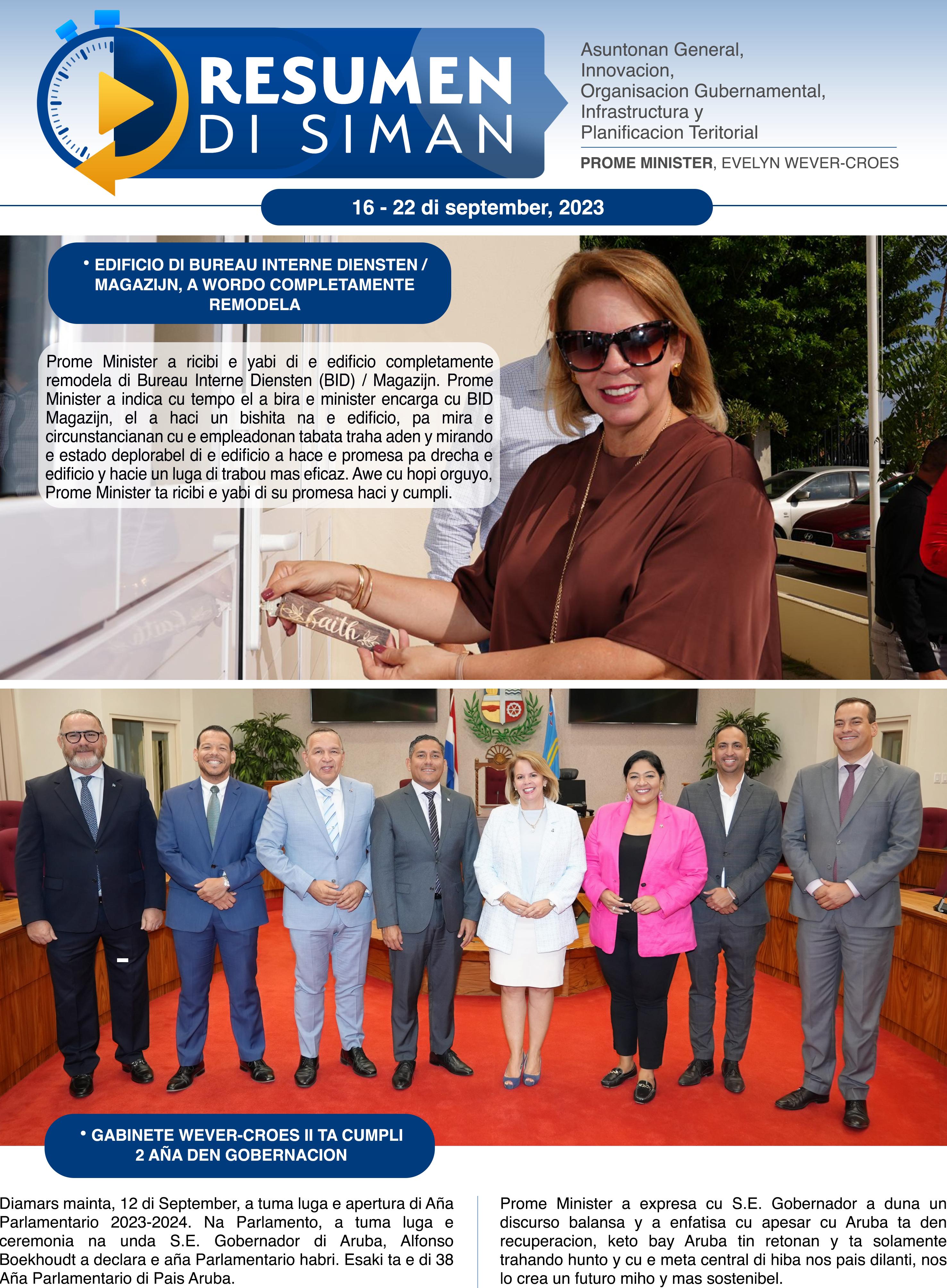 “E tabata un siman exitoso y fructifero pa Aruba y nos lo traha hunto y duro pa pronto esaki por traduci su mes tambe den proyectonan cu nos por finalisa na Aruba. Pa mi e ta un honor y orguyo di por representa mi dushi Aruba riba tarima internacional”, Prome Minister a expresa.
