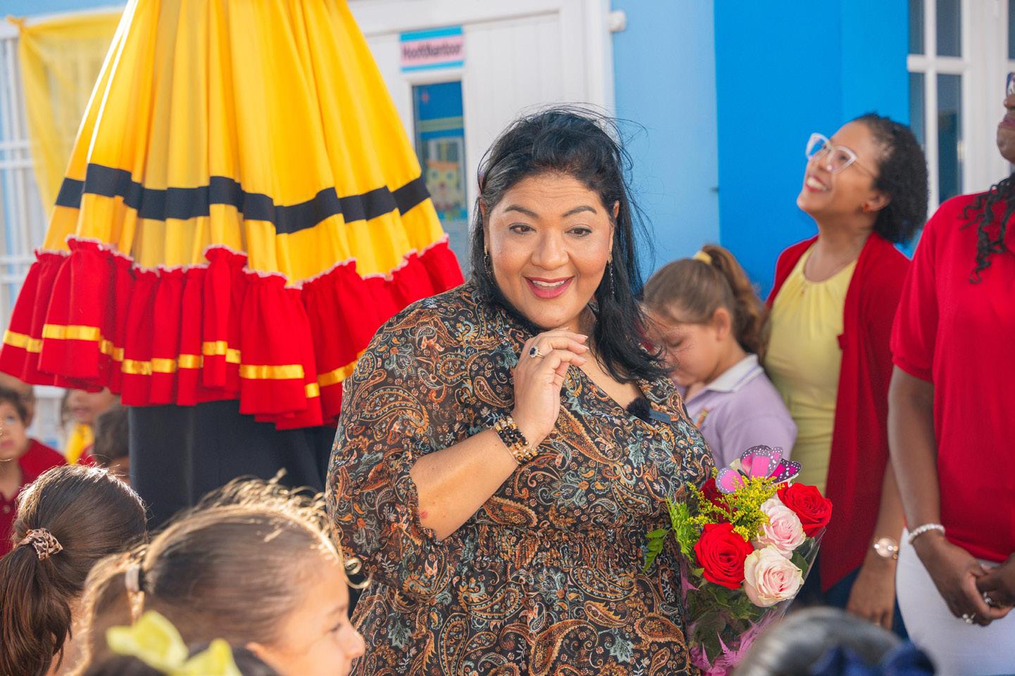 Dialuna mainta Dia di San Juan – Dera Gay, Minister di Cultura a haci un bishita na Scol Basico Kudawecha. Na su yegada Minister Maduro a wordo ricibi pa un comision di mucha cu ta yama Juan cu Juana y e Reina Infantil Xeena Dijkhoff. E hobencito “Juan” a entrega Minister Maduro un flor. E mandatario a pasa saluda e muchanan. A sigui cu e presentacion di e alumnonan riba escenario, kende a wordo acompaña pa un Tipico y algun alumno- y docente kende a participa den e Baile di San Juan.