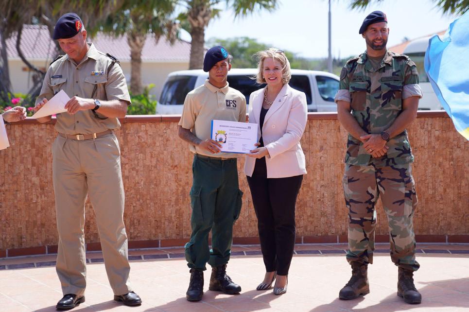 Diaranson mainta Prome Minister Evelyn Wever-Croes tawatin e honor di haci entrega di certificado na e cursistanan di SVT cu a termina e prome parti di e entrenamento. Esaki ta un entrenamento hopi pisa unda e hobennan ta haya formacion den disciplina, comunicacion, teamwork y tambe con pa traha riba nan metanan personal.