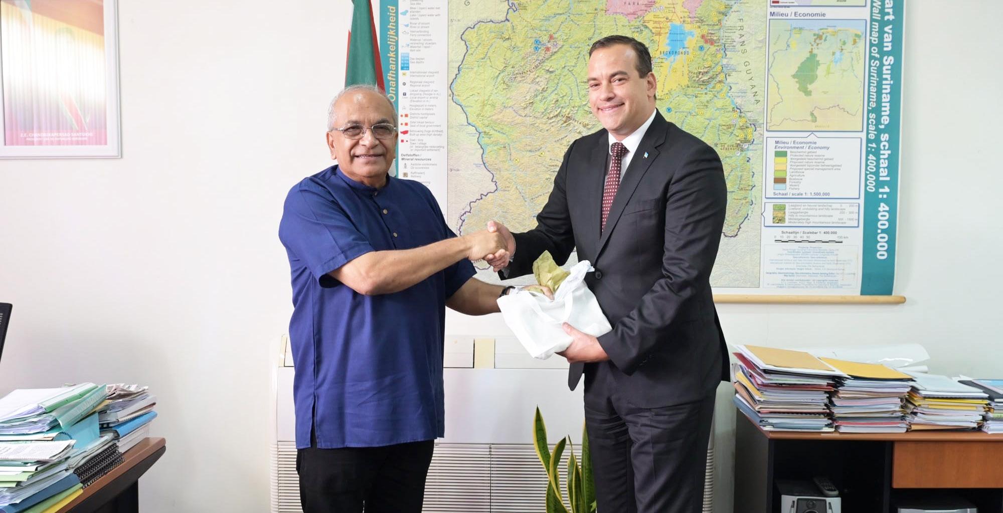 Diahuebs mainta Minister Geoffrey Wever y delegacion di Aruba a sinta cu Minister di Agricultura, Crea di Bestia y Pisca di Surinam Sr. Parmanand Swedien.