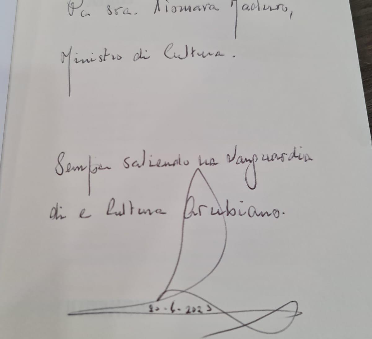 Minister Maduro a hiba un combersacion masha ameno cu sr. Quito y a gradici'e pa a keda scirbi y dedica antencion na Aruba y na nos dushi Papiamento. E mandatario a haci uzo di e oportunidad pa brinda e buki 'E cosecha di Juancho' cu a wordo dedica na e celebracion di Dia di San Juan e aña aki, na sr. Quito como recuerdo di su bishita cerca e mandatario.