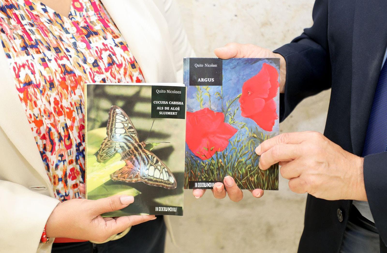 Siman pasa Minister Maduro a ricibi bishita di e escritor Arubiano residencia na Hulanda, sr. Quito Nicolaas, kende a presenta na e mandatario su ultimo dos obranan literario, Cucuisa Cabisha y Argus. Sr. Quito tin un trayectoria di mas di 40 aña como escritor y den su obranan semper a percura pa estrecha e lasonan literario entre Hulanda y Aruba. Pa su aporte balioso na literatura, sr. Quito Nicolaas a ricibi e reconocemento real di Officier in de Orde van Oranje-Nassau na aña 2022.
