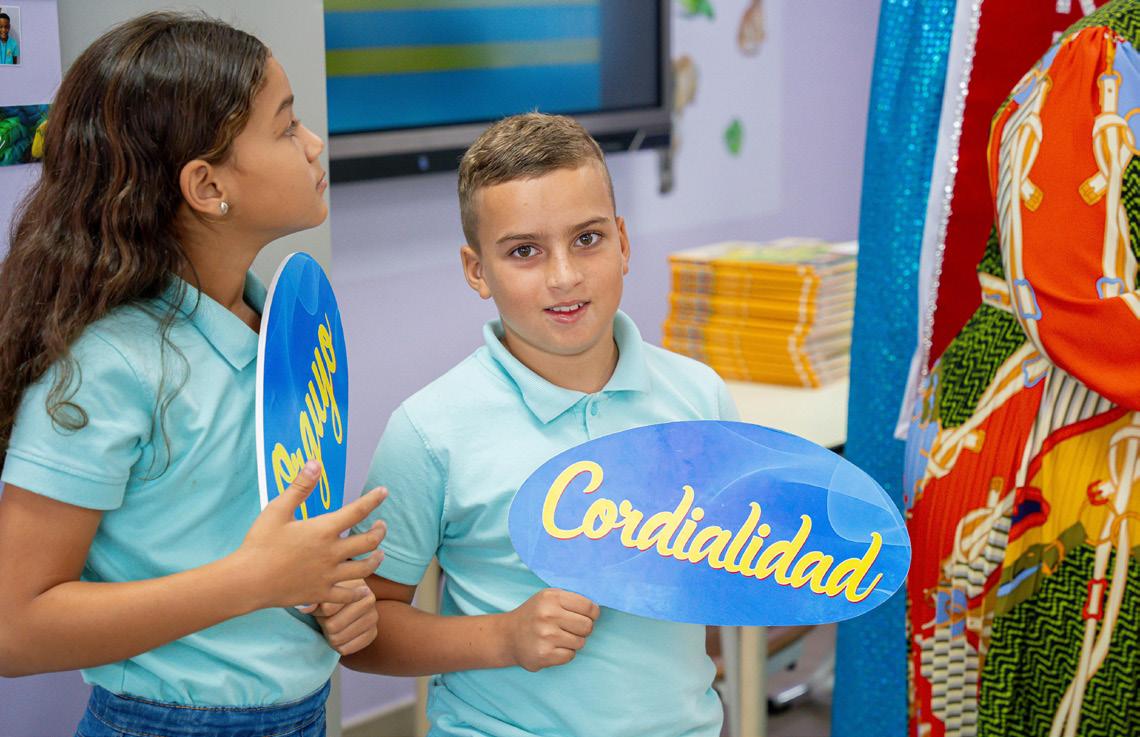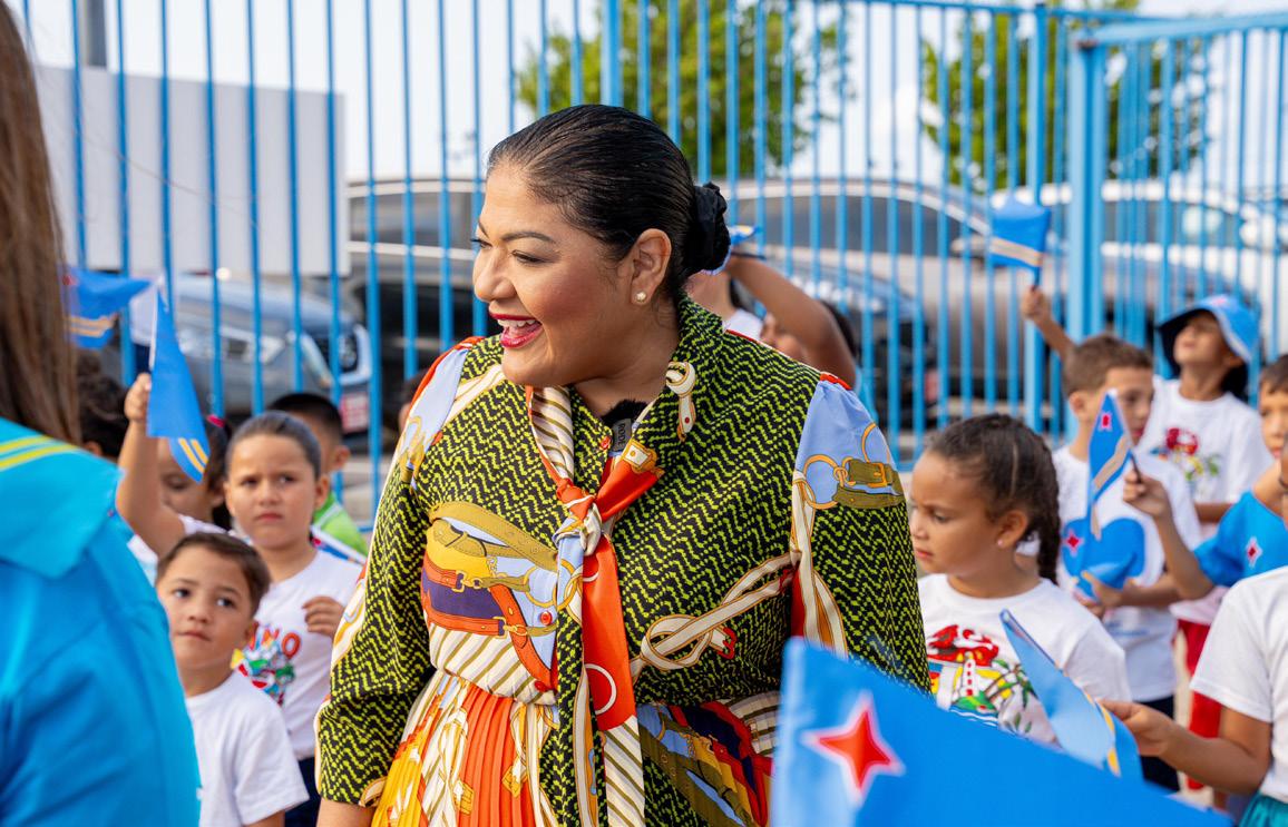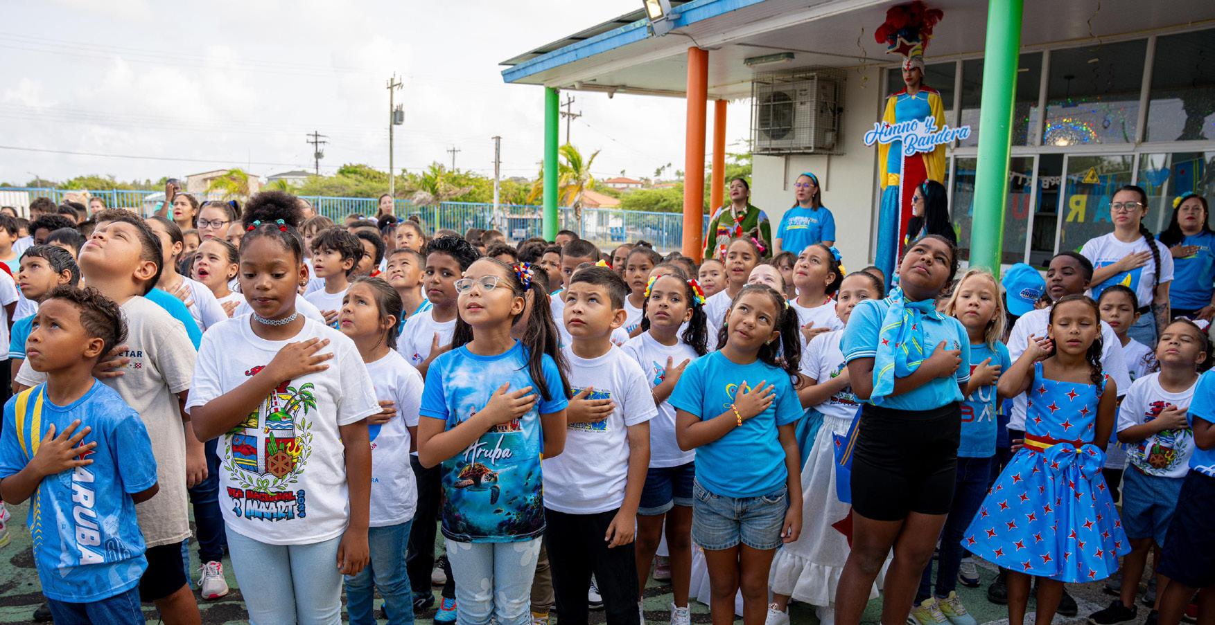 Na Colegio Pastor Kranwinkel, e mandatario a wordo ricibi pa henter e scol, caminda cu hunto cu e muchanan a hisa bandera y canta nos himno y e himno di nan scol.
