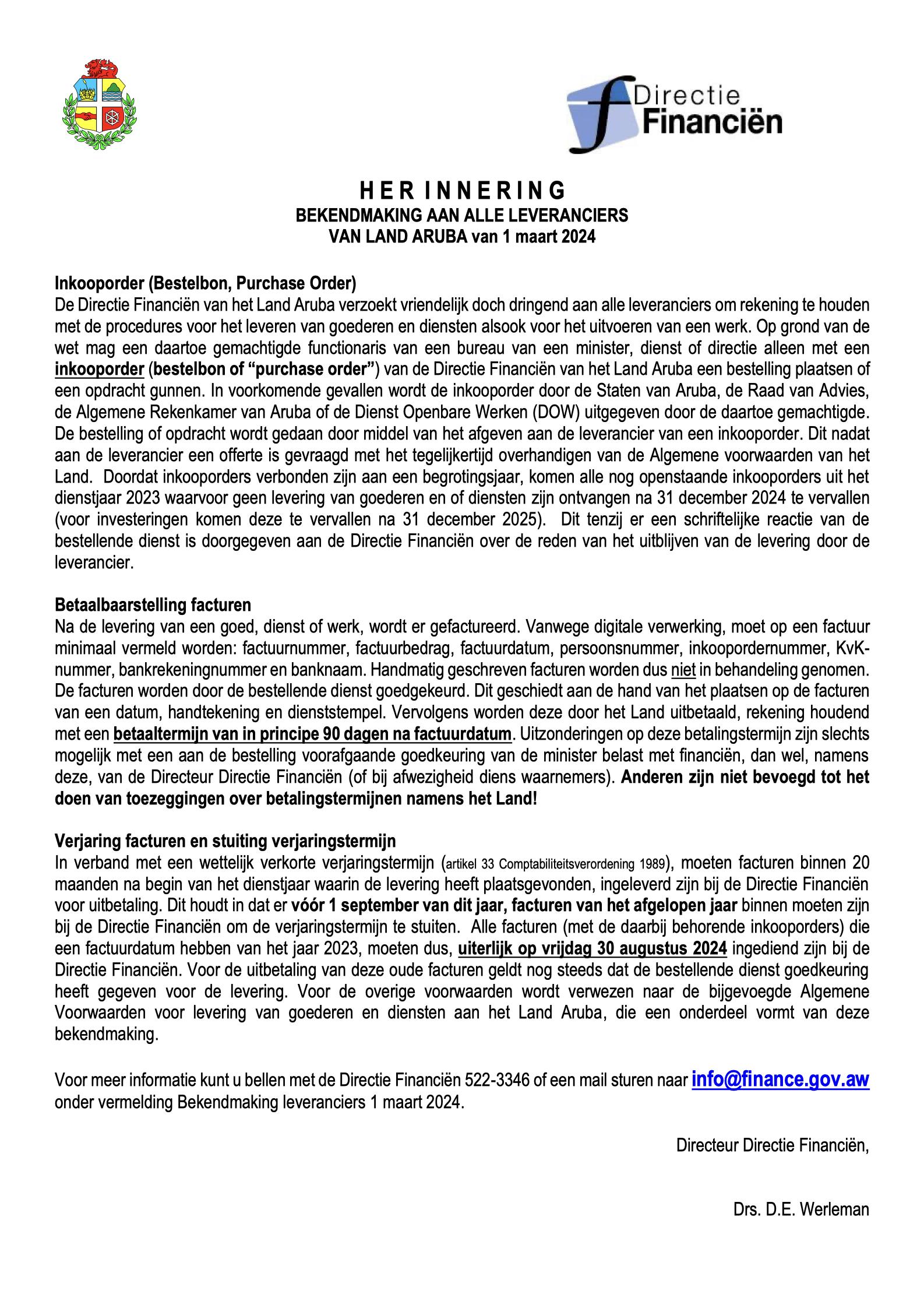 Pa mas informacion por bishita nos website: www.douane.aw y Facebook page. Alabes por tuma contacto cu nos na: info@ douane.aw of 523-8888.