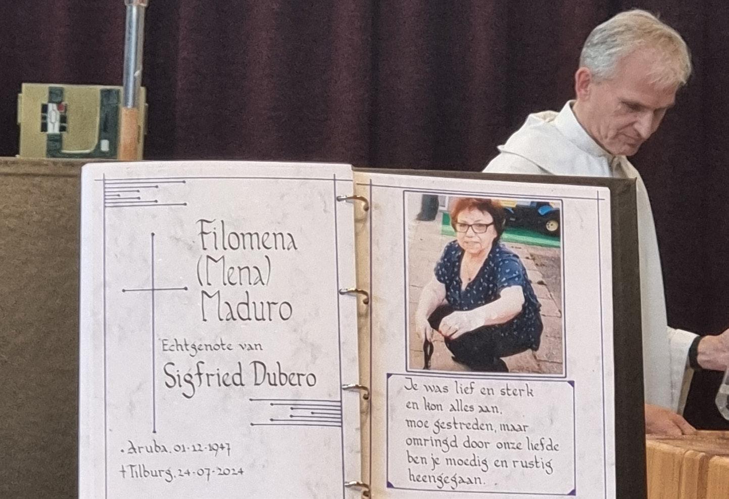 Na St. Lucas Kerk na Tilburg a tuma lugar un misa pa tuma despedida di Filomena (Mena) Maduro. Pa hopi aña Mena a fungi como presidente di Asociacion Nos Baranca cu entre otro tur aña tabata organisa e Festival di San Juan/Dera Gai. Hopi hende a presencia e ceremonia special aki y entre nan, Minister Plenipotenciario mr. Ady Thijsen, directora di Gabinete di Aruba Joselin Croes LL.M. Msc. Nuris Dabian, mr. Shandra John, Ivonne Navas y Sidney Kock.