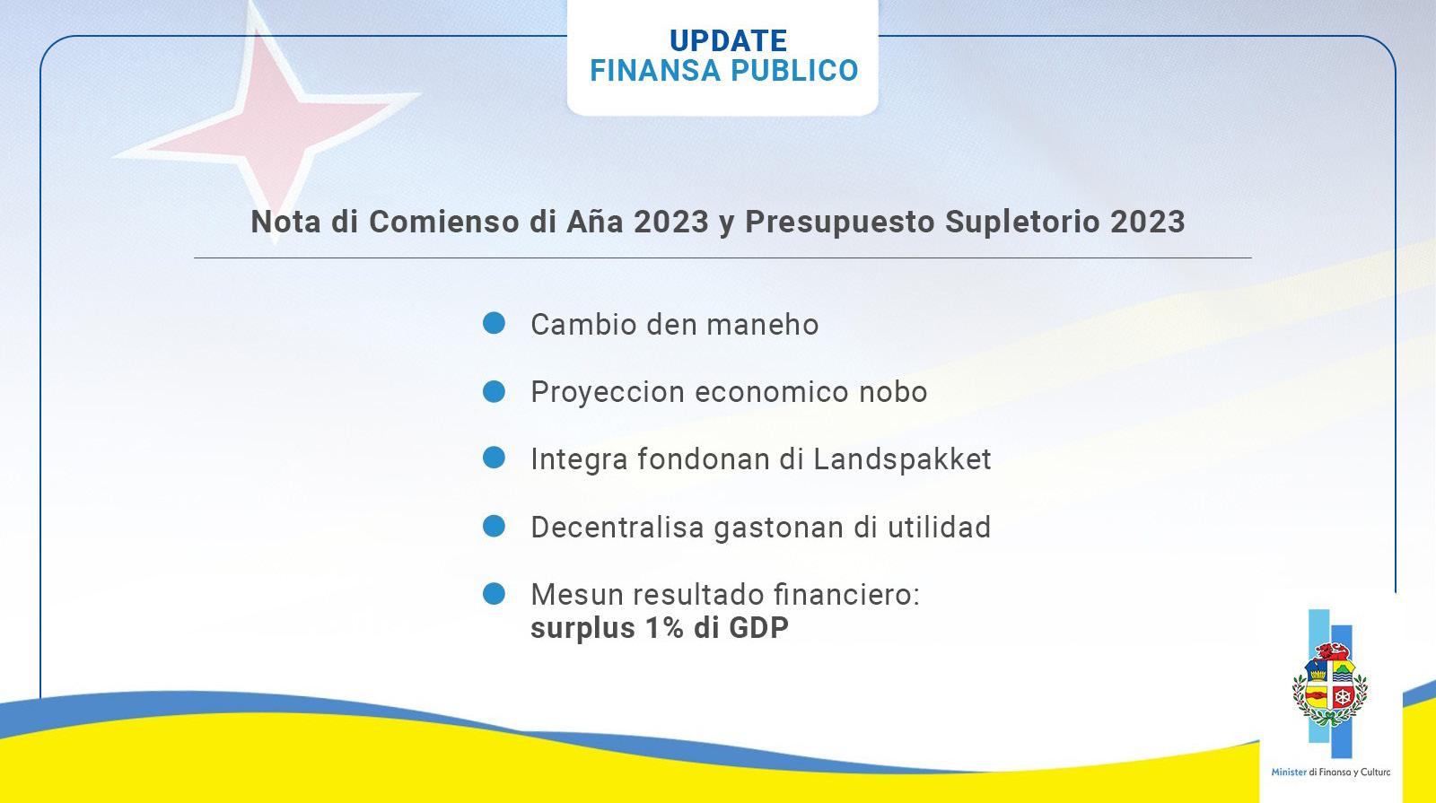 Debi cu algun cambio den maneho ta resulta den cambio financiero, e Nota di Comienso di Aña ta wordo compaña pa un Presupuesto Supletorio pa asina pidi Parlamento aprobacion pa e cambio den e cifranan den Presupuesto 2023. E Presupuesto Supletorio ta conta cu e projeccion di crecemento economico nobo publica recientemente pa Departamento Economico,