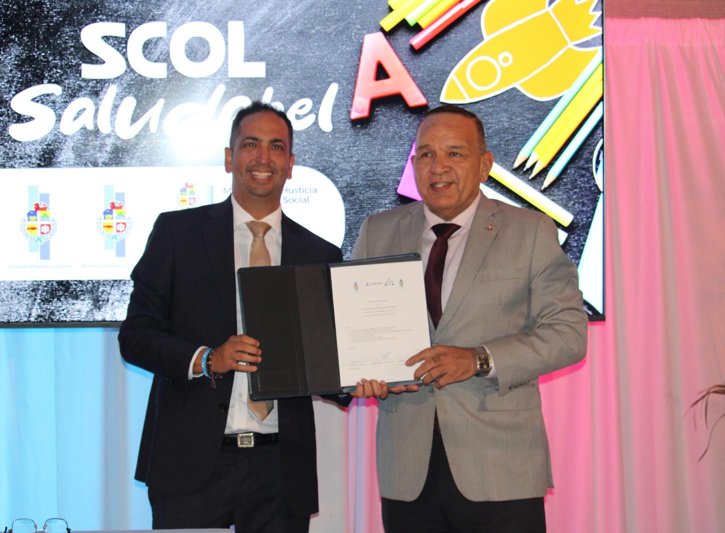 Tres Ministerio a uni pa duna sosten na un programa cu ta enfoca den crea un estilo di bida saludabel pa hobennan na Aruba. E programa no ta enfoca solamente riba salud fisico, pero tambe riba salud mental, movecion y bienestar di e muchanan. Mas saludabel un mucha ta, mas productivo e ta den bida. E programa di Scol Saludabel ta forma parti di e Plan Nacional di prevencion di e malesanan no transmitibel. Prevencion ta importante y esencial pa crea un comunidad mas saludabel y cu menos malesa cronico.