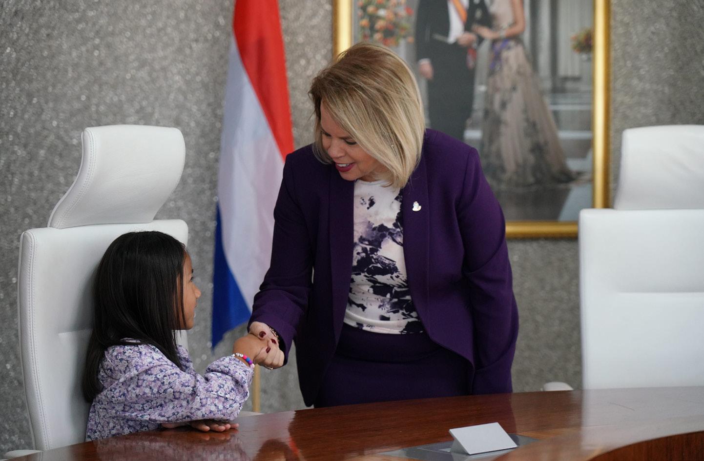 E hobennan Izabella Yung, Evanee Isabella Fuentes, Maerd Farro, Roxanne Rasmijn, Xiany Paesch, Iva Werleman y Luciana Isabella Willems cu hopi alegria y emocion a bishita Prome Minister den su oficina y den sala di Conseho di Minister na unda nan a haya oportunidad pa scucha kico tur ta pasa den e Conseho di Minister y a haya oportunidad tambe pa saca un potret cu Prome Minister.