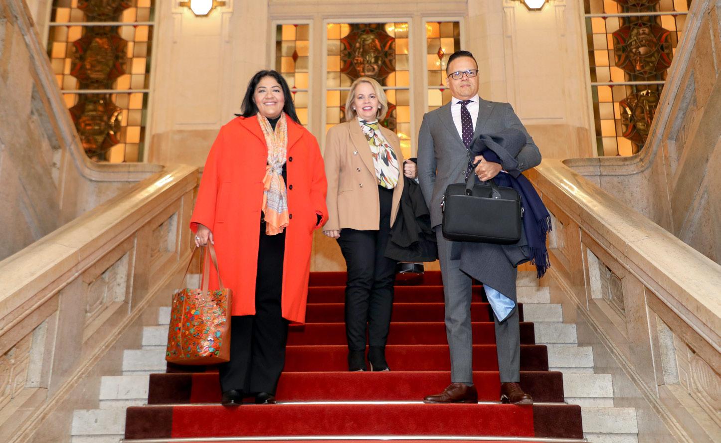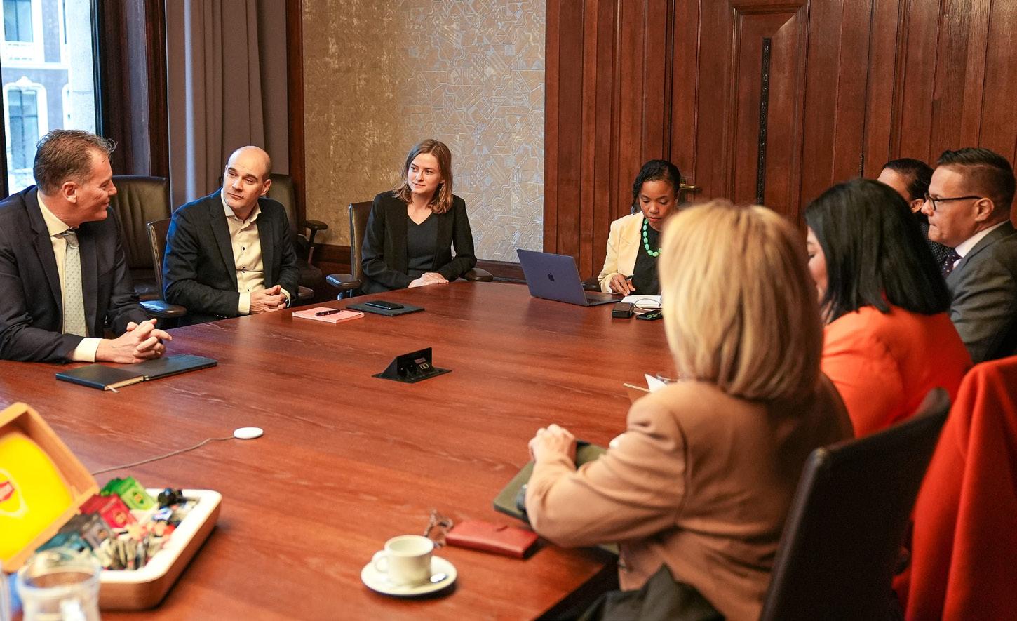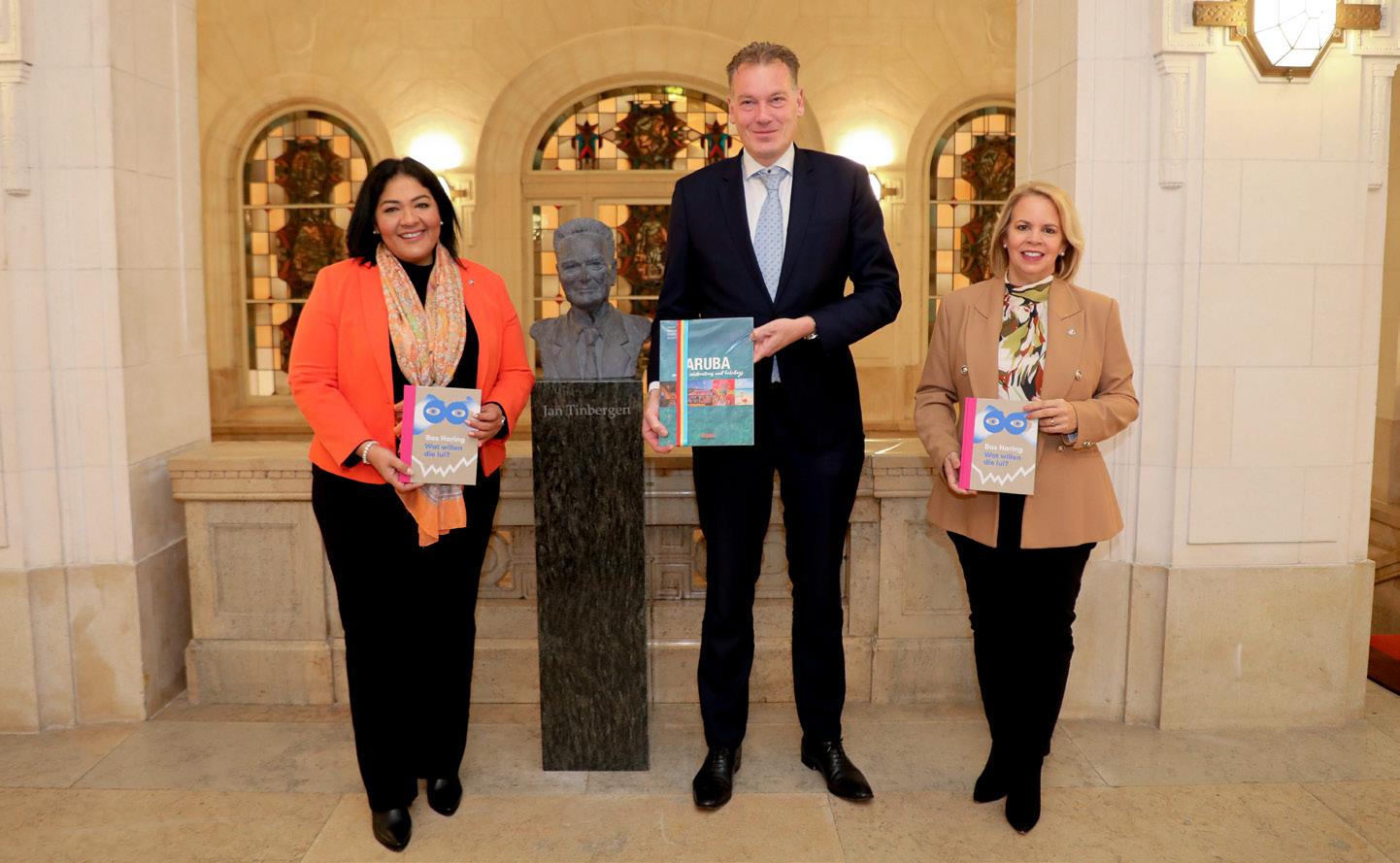 Prome Minister Evelyn Wever-Croes durante su bishita di trabou na Hulanda, diabierna ultimo a bishita Arubahuis pa asina reuni cu Minister Plenipotenciario señor Ady Thijsen, directora interino señora Glenda Hernandes y combersa cu e trahadonan. “Ta hopi importante na momento cu mi ta na Hulanda pa bishita Arubahuis pa mi por mira y scucha personalmente e preocupacionnan cu tin”, Prome Minister a expresa.