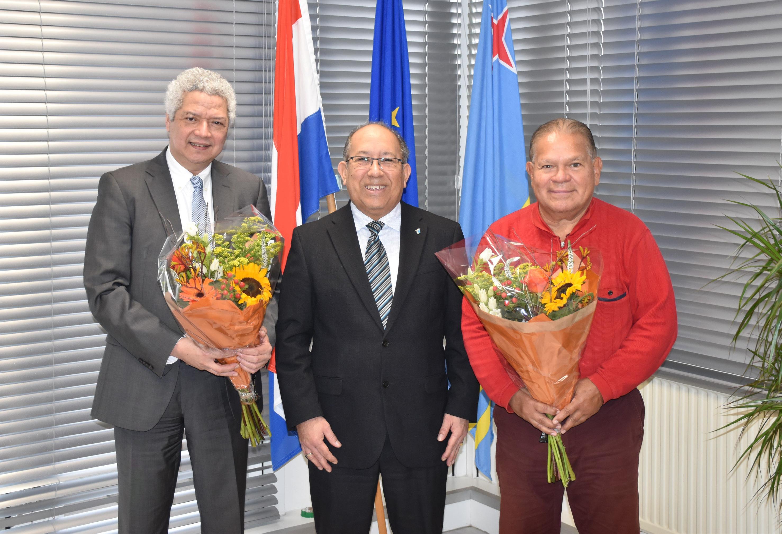 Minister Plenipotenciario mr. Ady Thijsen a ricibi den su oficina dos hubilario di Arubahuis pa gradicinan pa nan añanan den servicio di Pais Aruba. Ta trata di Martin Flanegin y Sidney Kock. Segun e mandatario esaki ta un muestra di dedicacion pa e trabao cu ambos a bin ta haci pa Arubahuis pa añanan largo. Tambe minister Thijsen a bisa di ta convenci y tin confiansa cu tanto sr. Flanegin y sr. Kock lo sigi cu e bon trabao pa Arubahuis y Pais Aruba pa e añanan cu ainda nan ta den servicio di Arubahuis.