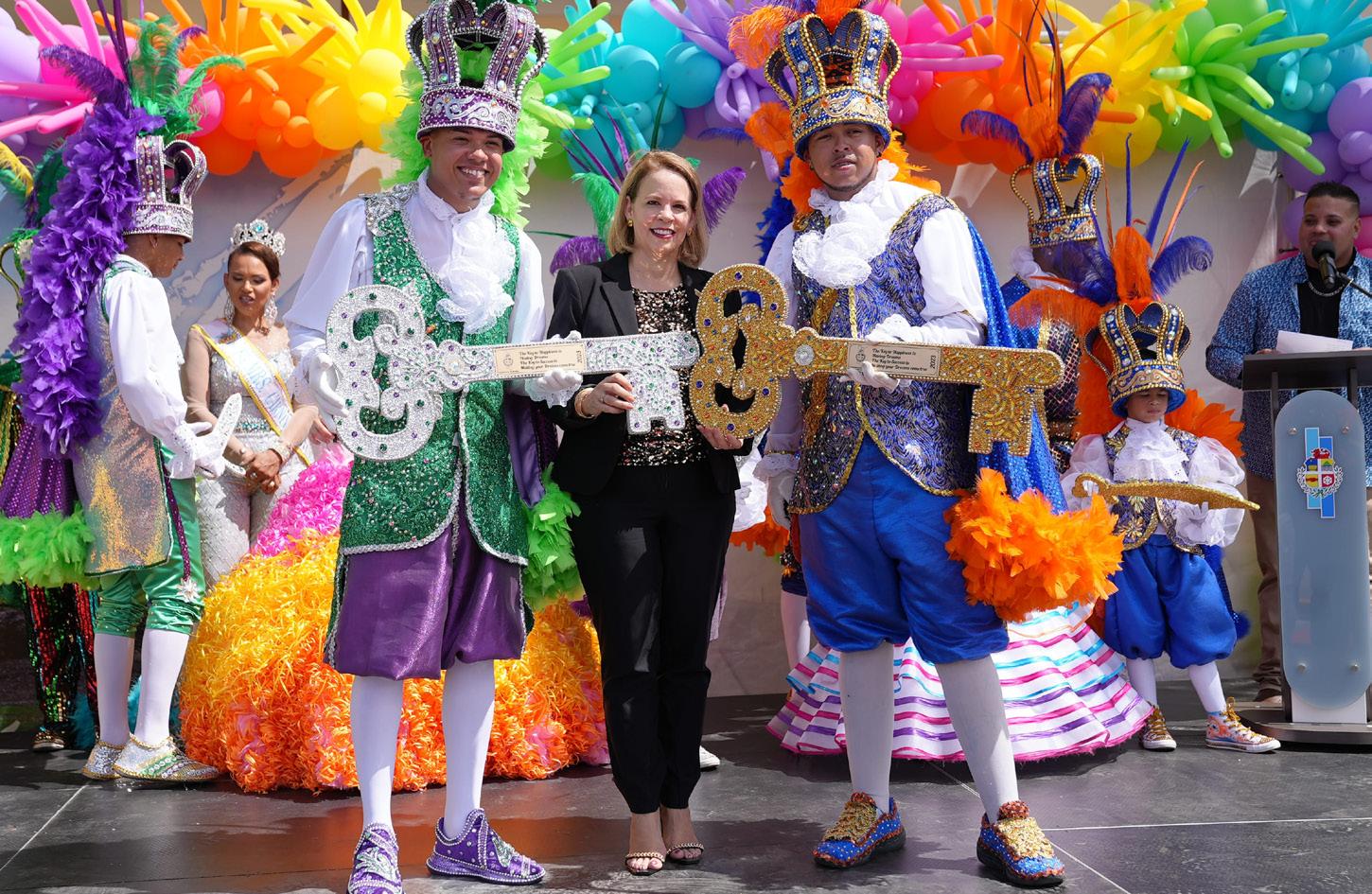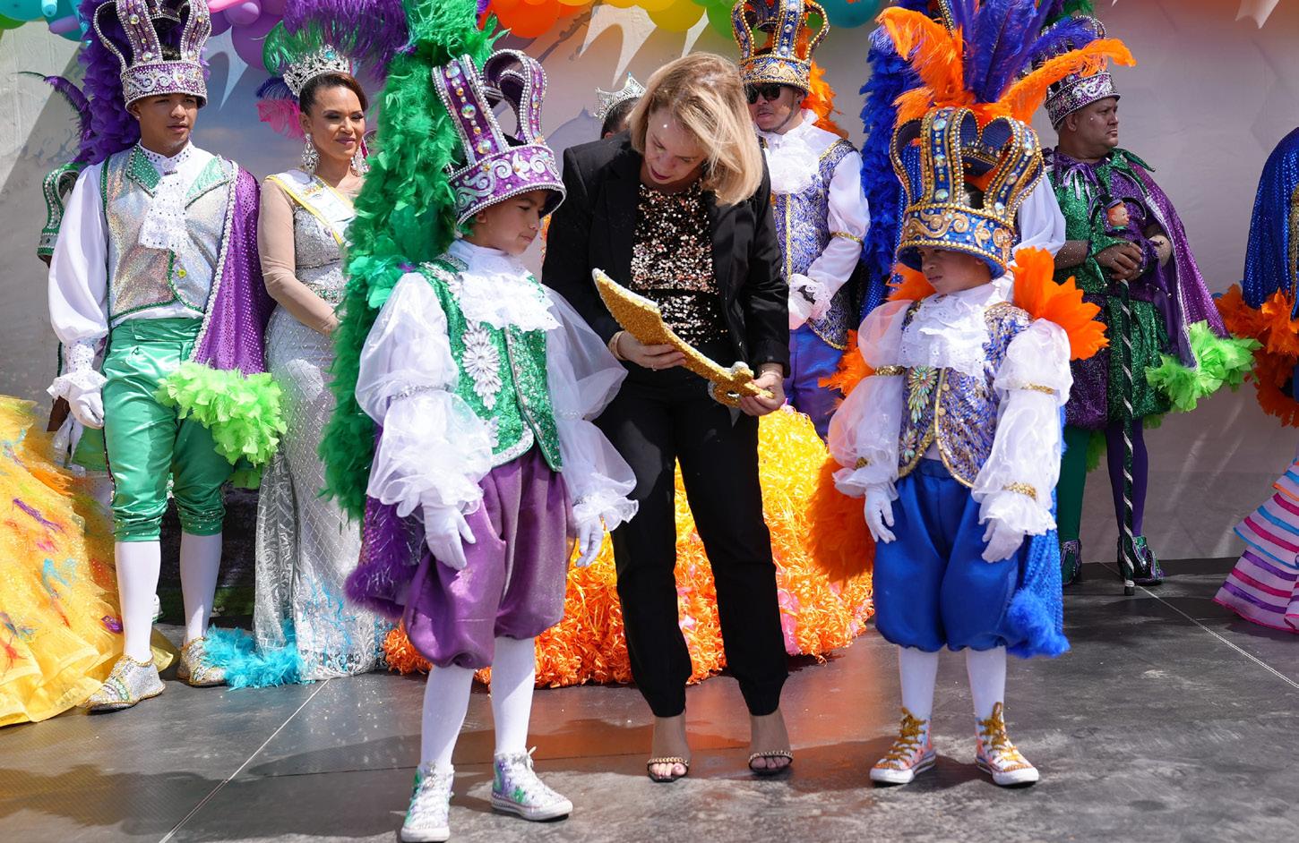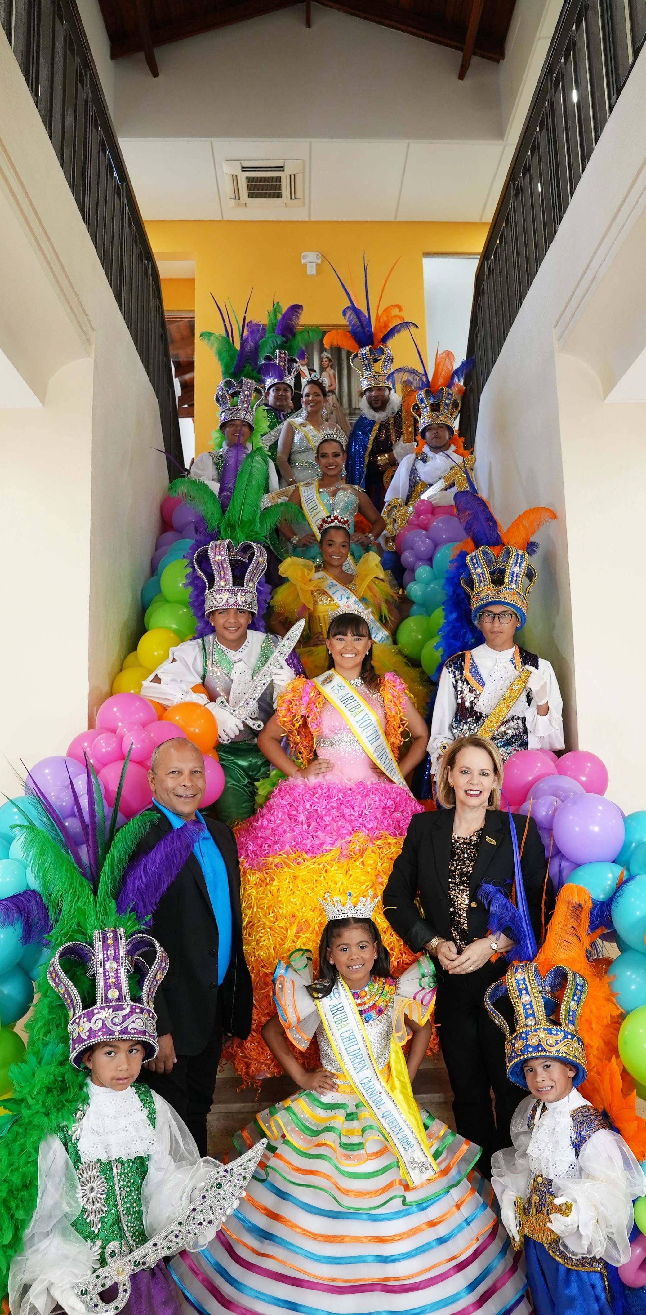 Diadomingo mainta a tuma luga na Bestuurskantoor e traspaso di mando simbolico pa Prins y Pancho 2023 pa Aruba su Carnaval 69. Prome Minister Evelyn Wever-Croes, den su discurso dirigi na e royalnan di Carnaval y na e publico presente, a expresa cu pa Gobierno di Aruba, e ta un placer y honor pa habri porta di e oficina di gobernacion pa ricibi nos celebridadnan di Carnaval 69.