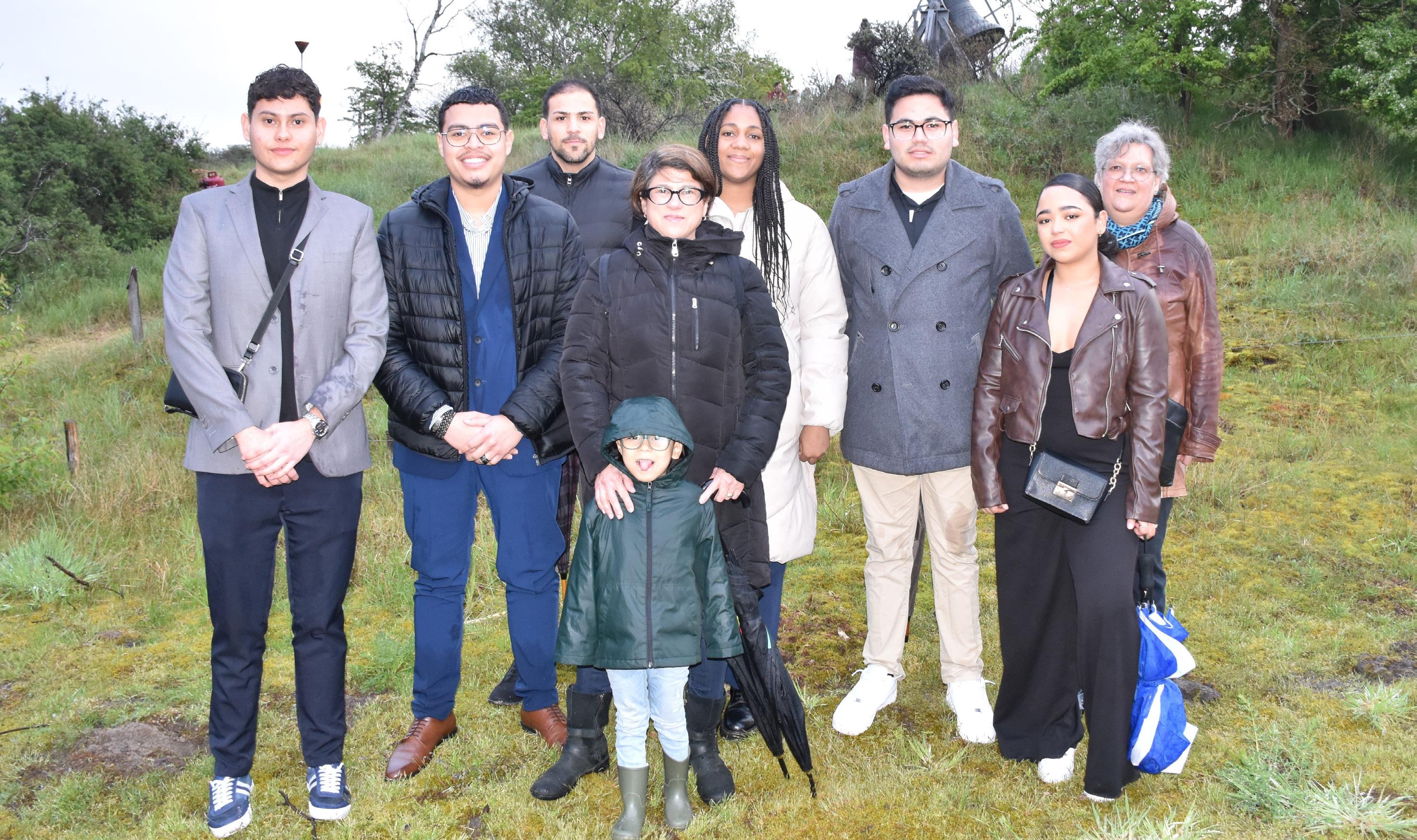 Na e monumento na Waalsdorpervlakte e studiantenan Arubiano a pone un krans acompaña pa directora Joselin Croes y funcionario di departamento di Enseñansa di Gabinete di Aruba Ivonne Navas.