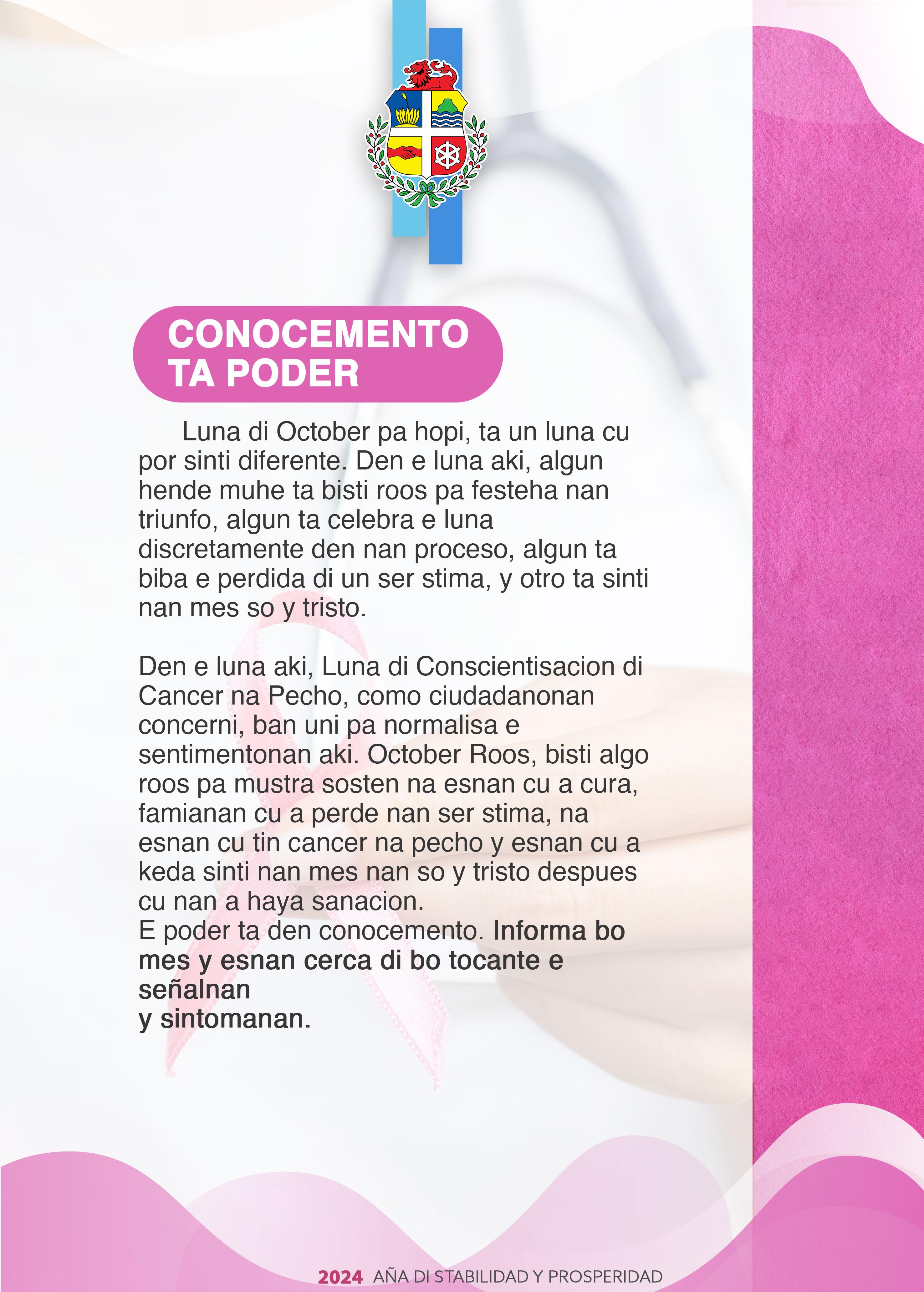 Luna di october ta e luna cu mundialmente ta para keto na conscientisacion di cancer di pecho. Mientras e prome siman di conscientisacion a pasa, ta importante pa keda enfatisa e importancia di conscientisa nos comunidad. Cancer di pecho ta un realidad cu ta afecta hopi persona y famia riba nos isla. Y esaki ta un motibo fuerte, pa no solamente aumenta conscientisacion, pero tambe pa fomenta compacion y comprension entre cada un di nos.