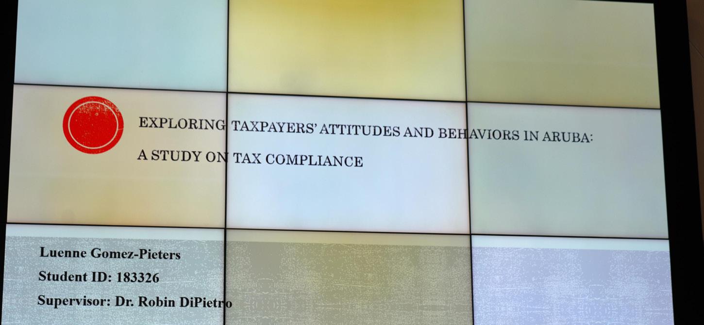 Recientemente Prome Minister Evelyn Wever- Croes hunto cu Minister di Finansa y Cultura, señora Xiomara Maduro tawata na Universidad di Aruba pa presencia e presentacion di tesis di sra. Luenne Gomez-Pieters, cu a caba su estudio di MBA. E tesis di Luenne unda el a score un A, a trata un investigacion riba e cumplimento cu impuesto, cu ta trata e actitud y comportacion di e pagadonan di impuesto na Aruba.