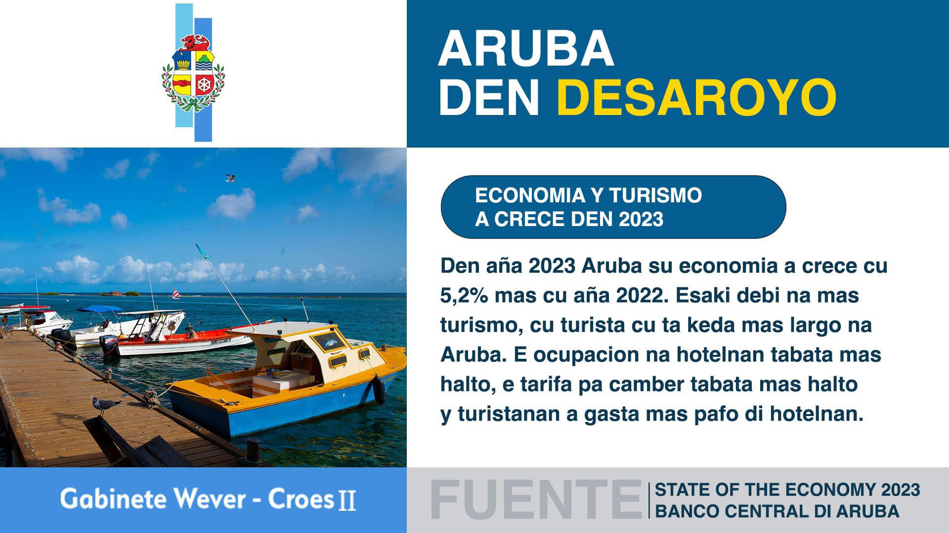 Entre otro, Banco Central ta indica cu Economia y Turismo a crece cu 5,2 porciento mas cu aña 2022. Esaki ta danki na nos turismo cu cu a crece, mas turista ta bishita Aruba y ta haci nan estadia mas largo. Ocupacion den hotelnan tambe tawata mas halto como tambe e tarifanan di e cambernan. Tambe turistanan ta gasta mas pafo di hotelnan.