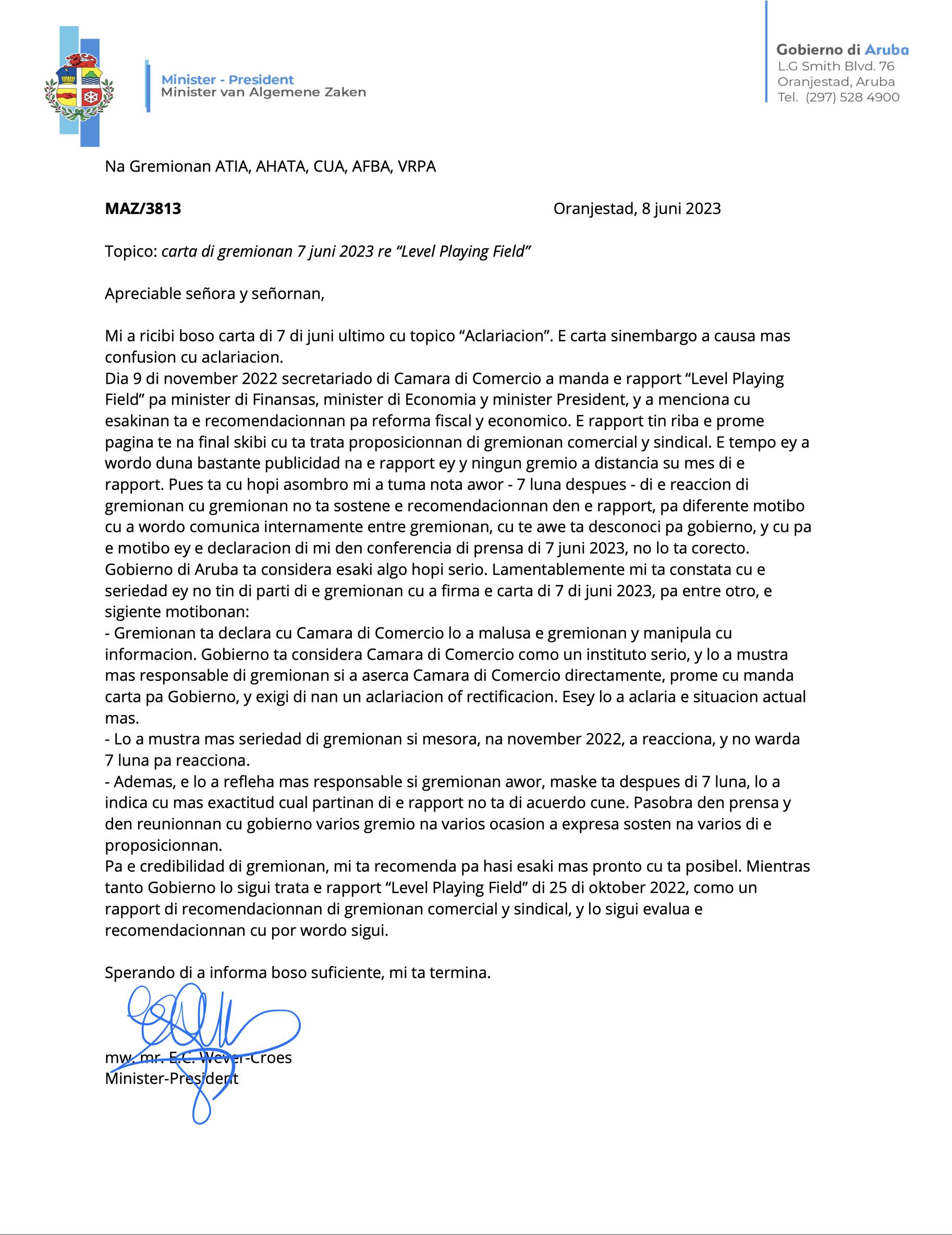 Diaranson 7 di juni, Prome Minister Evelyn Wever-Croes a ricibi un carta di gremionan cu e topico ‘Aclariacion’. Prome Minister diahuebs 8 di juni a contesta e carta aki y a manda pa gremionan indicando na nan cu e carta ricibi for di gremionan a causa mas confusion cu aclariacion pa cua motibo tambe Prome Minister pa medio di e carta manda na gremionan, ta trece aclariacion riba e rapport “Level Playing Field”.