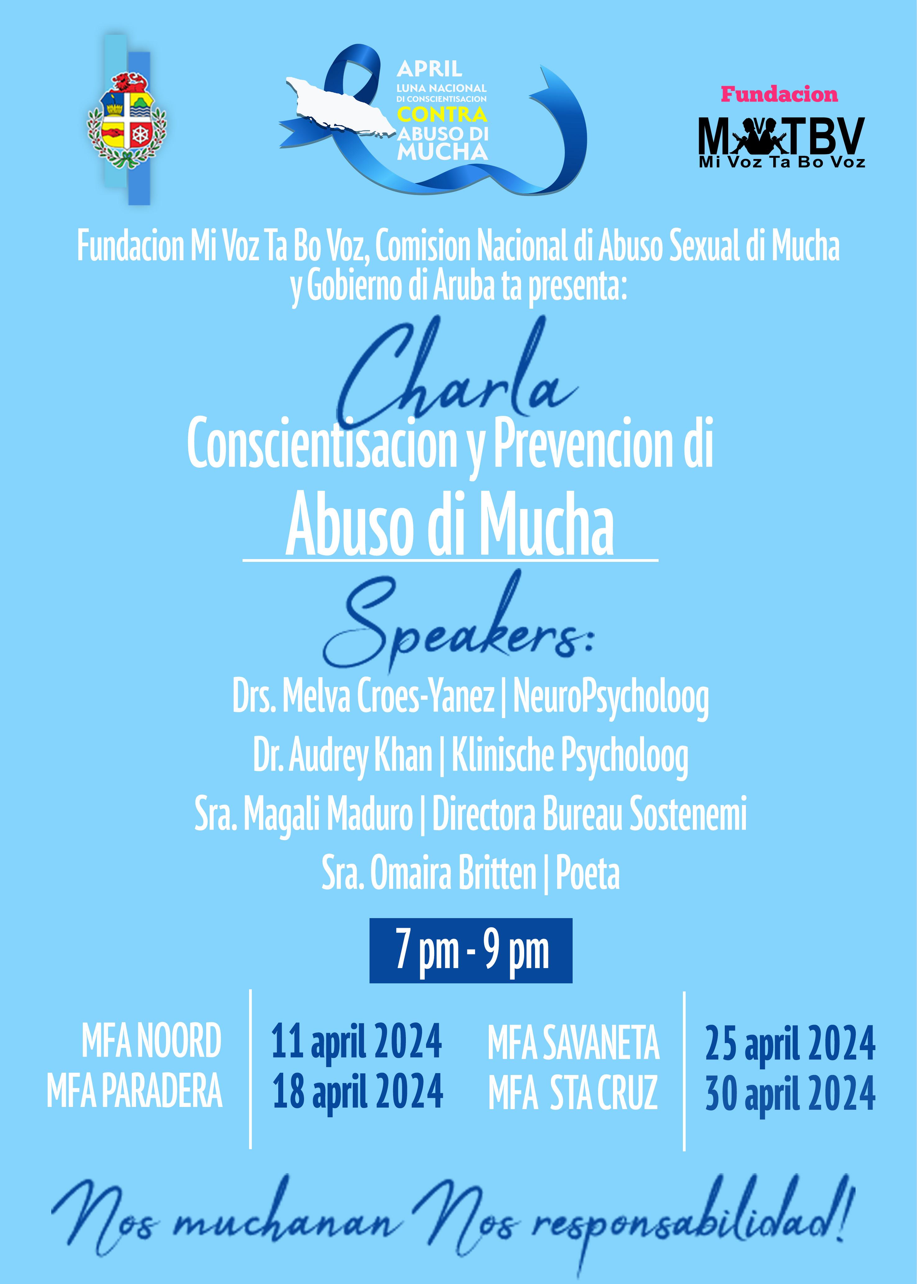 Prome Minister, Evelyn Wever-Croes, den nomber di Gobierno di Aruba, ta extende un invitacion na henter nos comunidad pa uni na e evento importante di solidaridad aki diabierna awo, 12 di april cuminsando pa 6or di atardi, pa Cende Luz Blauw pa conscientisacion y prevencion di abuso di mucha.