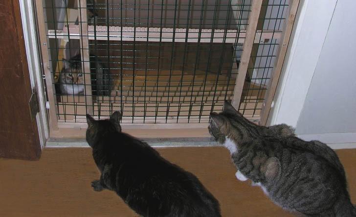 This barrier can then be rotated to fit in other doorways to enable the resident cat to encounter the newcomer in other areas. Allow each cat to approach or hide as they choose.