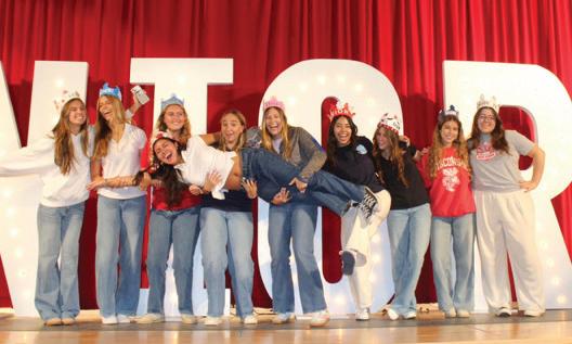 FINAL PHOTOSHOOT: On Aug. 23, seniors pose on stage with friends in their decorated crowns to commemorate their last year as high school students.