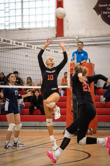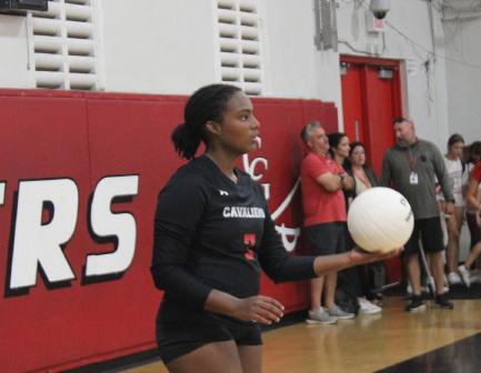 Setting the ball, Junior Corina McDanal lines junior Isabella Cruz up for a spike against Gables’ rivals, the Miami High Stingarees, on August 28. The lady Cavaliers won with a fnal score of 3-0, upholding a 90% win this season.