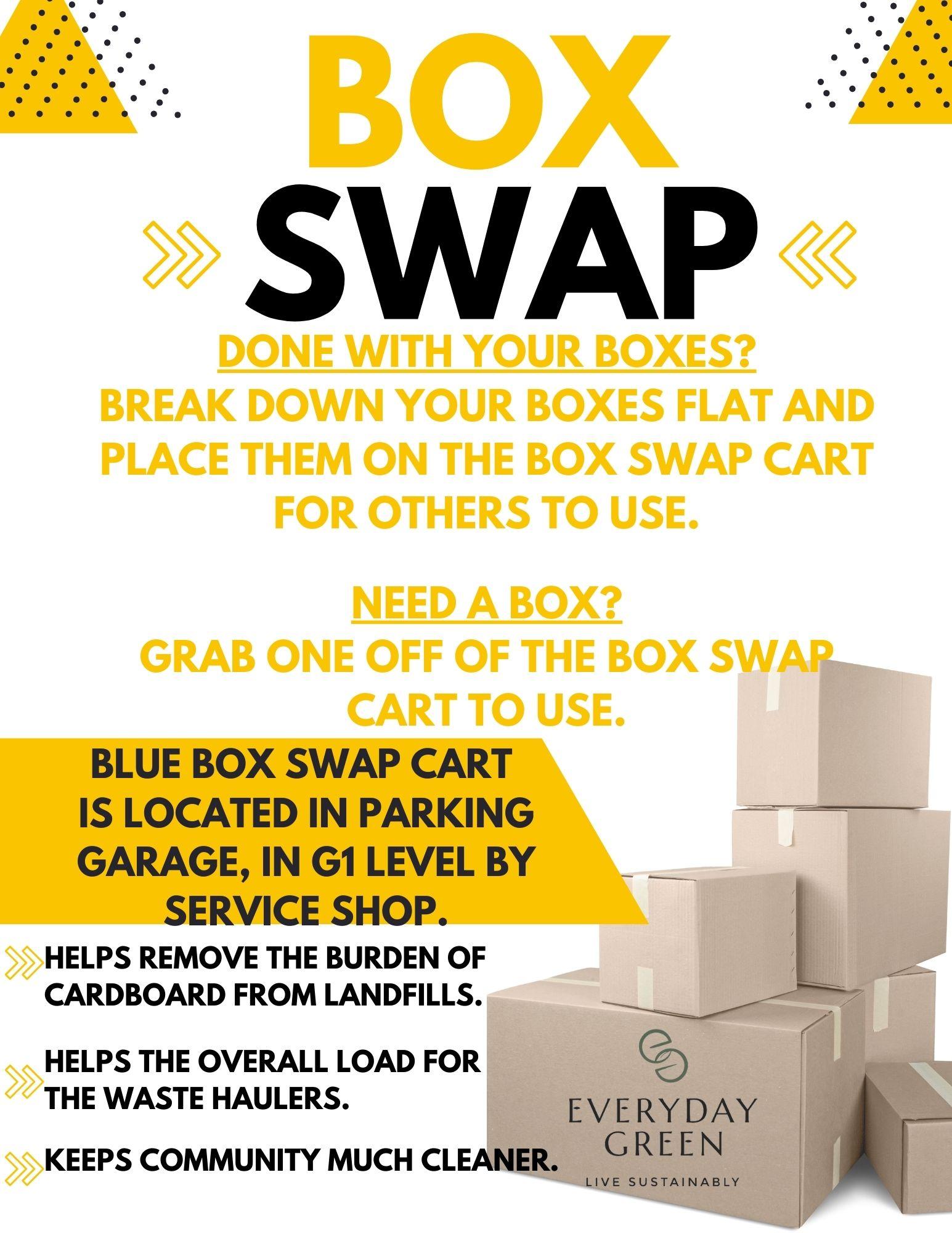It is helpful to everyone in the community if everyone breaks down all boxes and disposes of them next to the recycling bins. We will take care of the rest. We do ask that you do not use the trash chutes for boxes, as they can block the chute and create undesirable overflow. In addition to recycling, we have a green initiative in our community called “Box Swap”. Break down your boxes flat and place them on the box swap cart for others to use. Blue box swap cart is located inside the parking garage, G1 level, by maintenance shop. This will help other residents that need cardboard boxes while consciously disposing of your boxes that are in good condition.