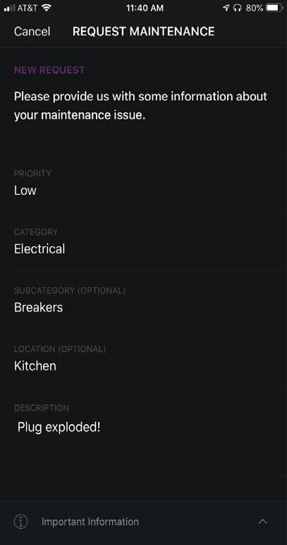Provide information about your maintenance request using the form within the App. See screenshots for reference.