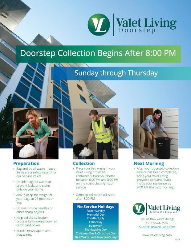 Please dispose your trash in the trash chutes located on each floor or valet trash pickup.