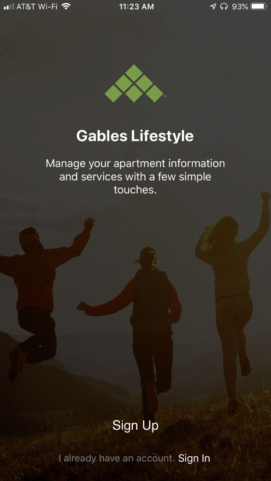 1) Go into your App store and search for Gables Resident App. Once you download the App and click into it, you’ll see the below home screen appear. Click sign in and use your same login credentials you’ve previously used for RentCafe.