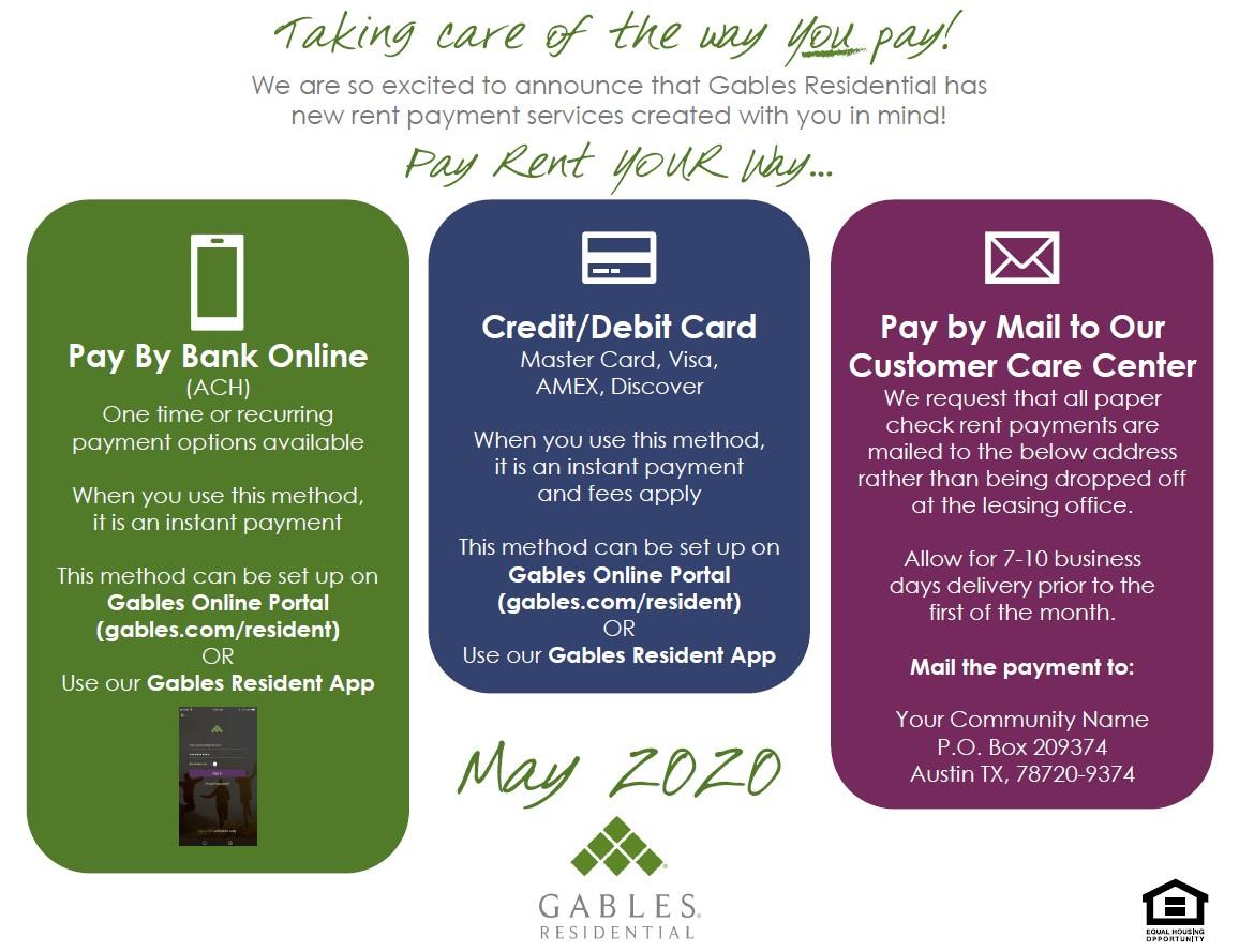 We are so excited to announce that Gables Residential has new rent payment services created with you in mind!