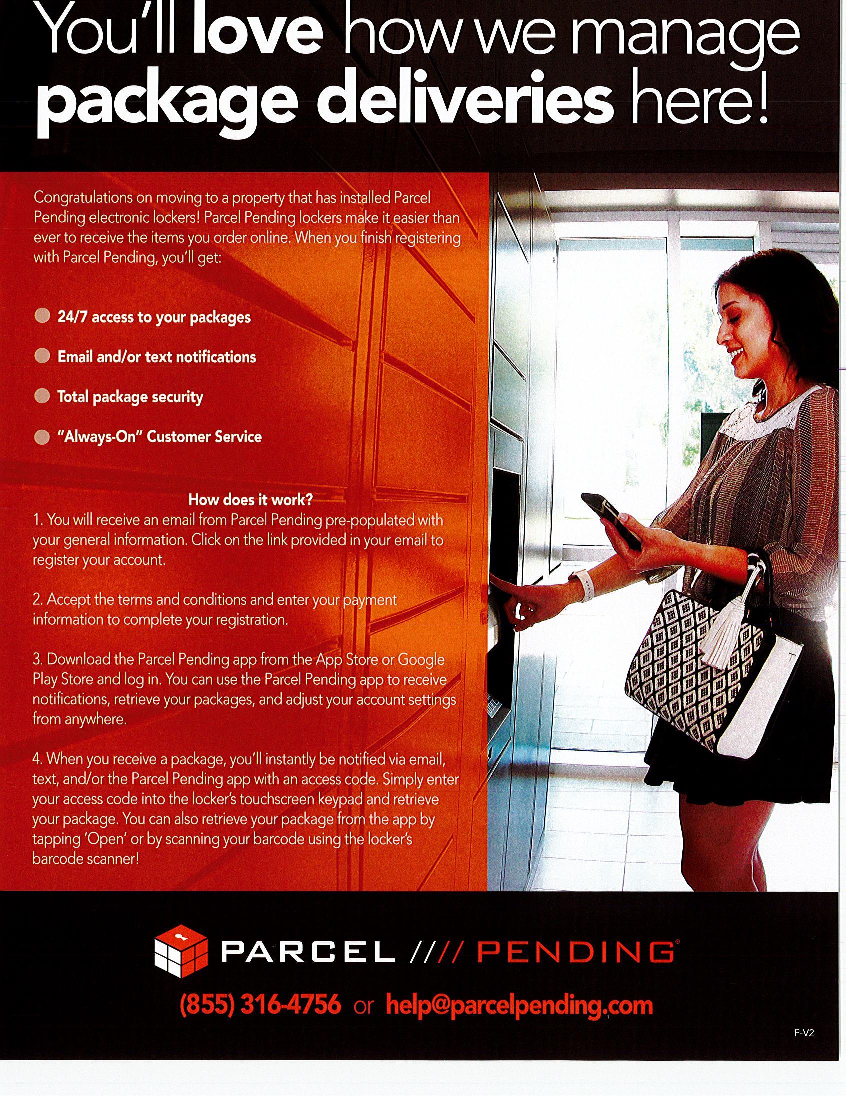 Delivery people will need to contact you regarding delivery arrangements. Packages will be delivered to the Parcel Lockers and oversized packages may be delivered to your home. If you have visitors, please feel free to call the office at (972) 910-8343 to allow visitor access into the building. You may also allow access to a visitor when you are not here by signing a key release at the office. However, keys can only be accessed during business hours; and all keys must be returned to the office by 5pm every day.