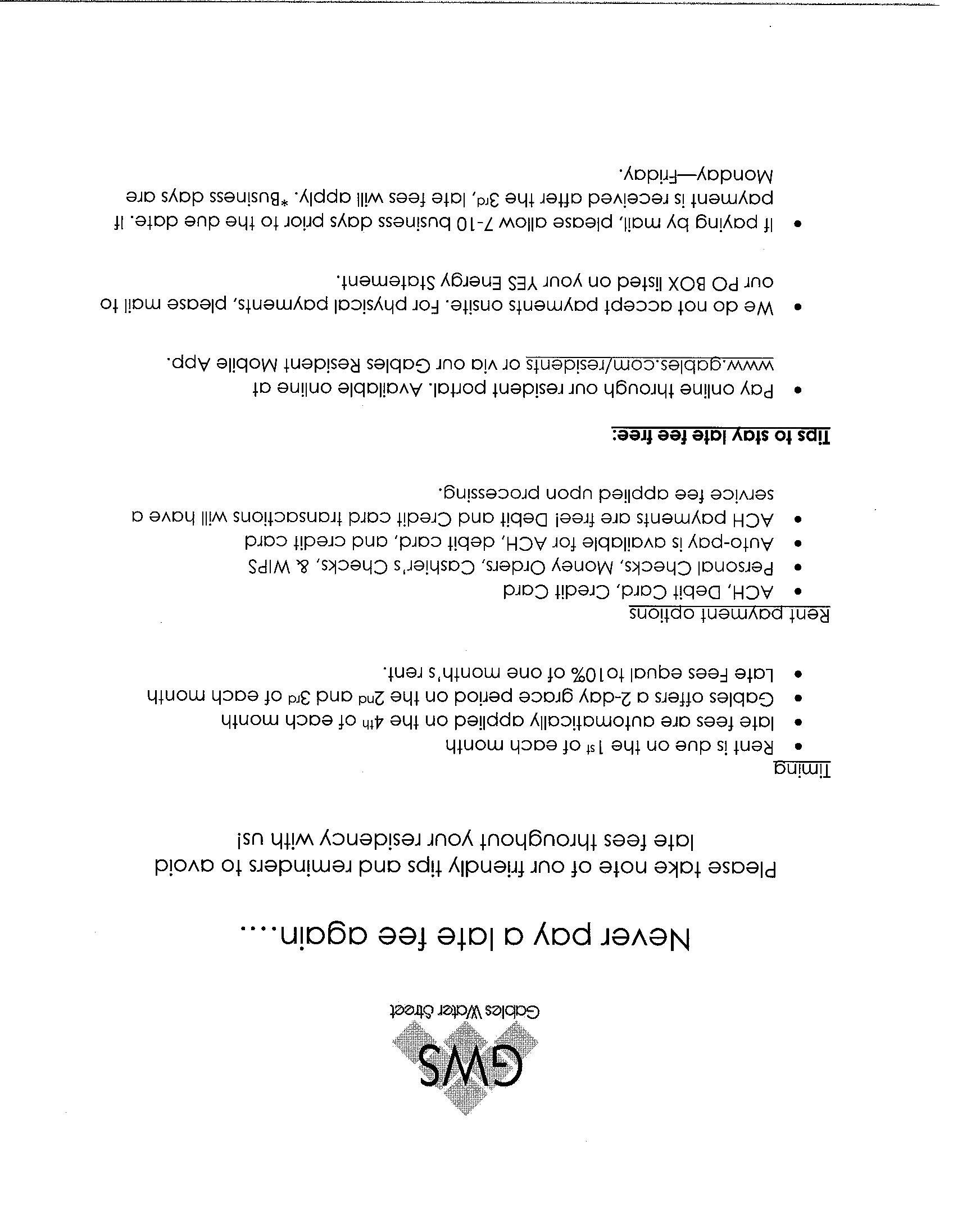 Please use Rent Café to pay rent online. You will go to http://www.gables.com and click on the Resident Login in the upper right-hand corner. Select the link to set up your Rent Café account. This is a great way to stay connected to your management team from anywhere in the world. Additional services available on Rent Café include placing a service request for repairs needed in your apartment home.