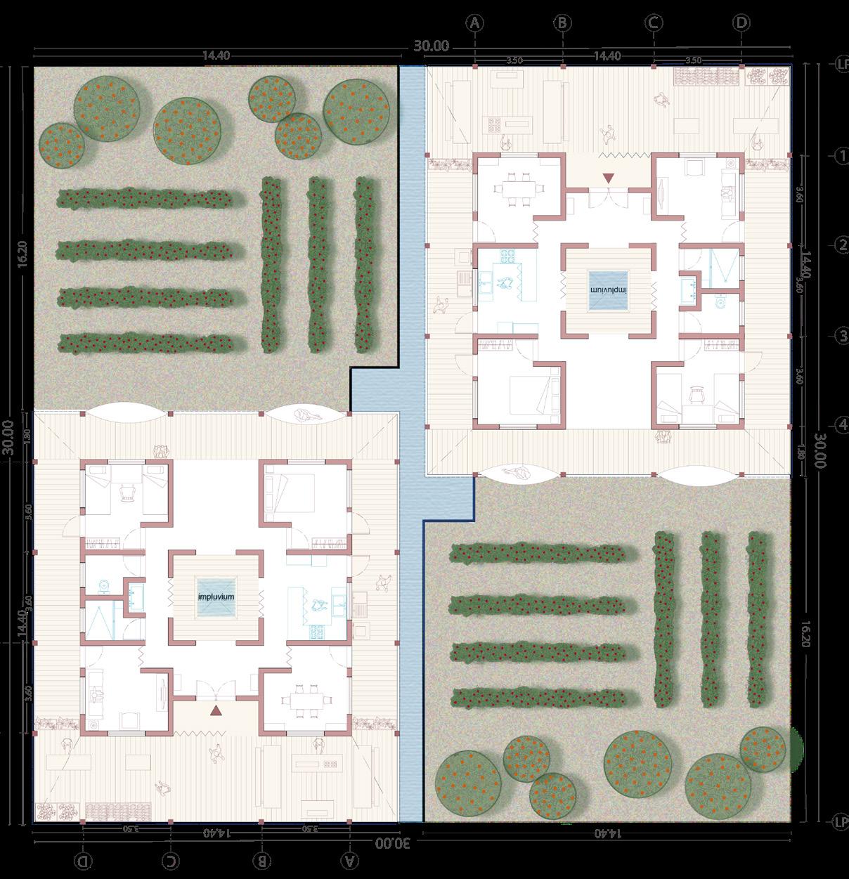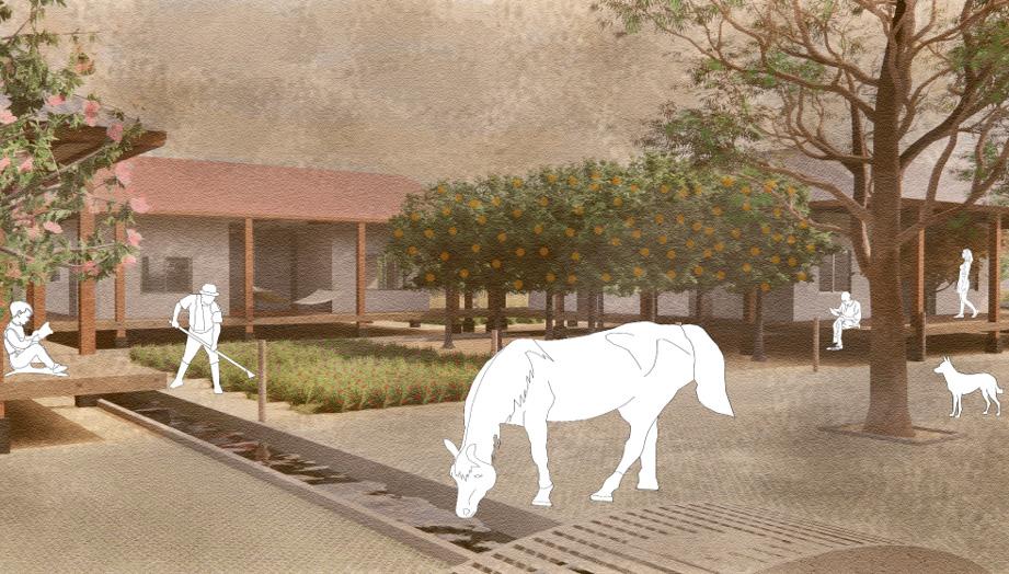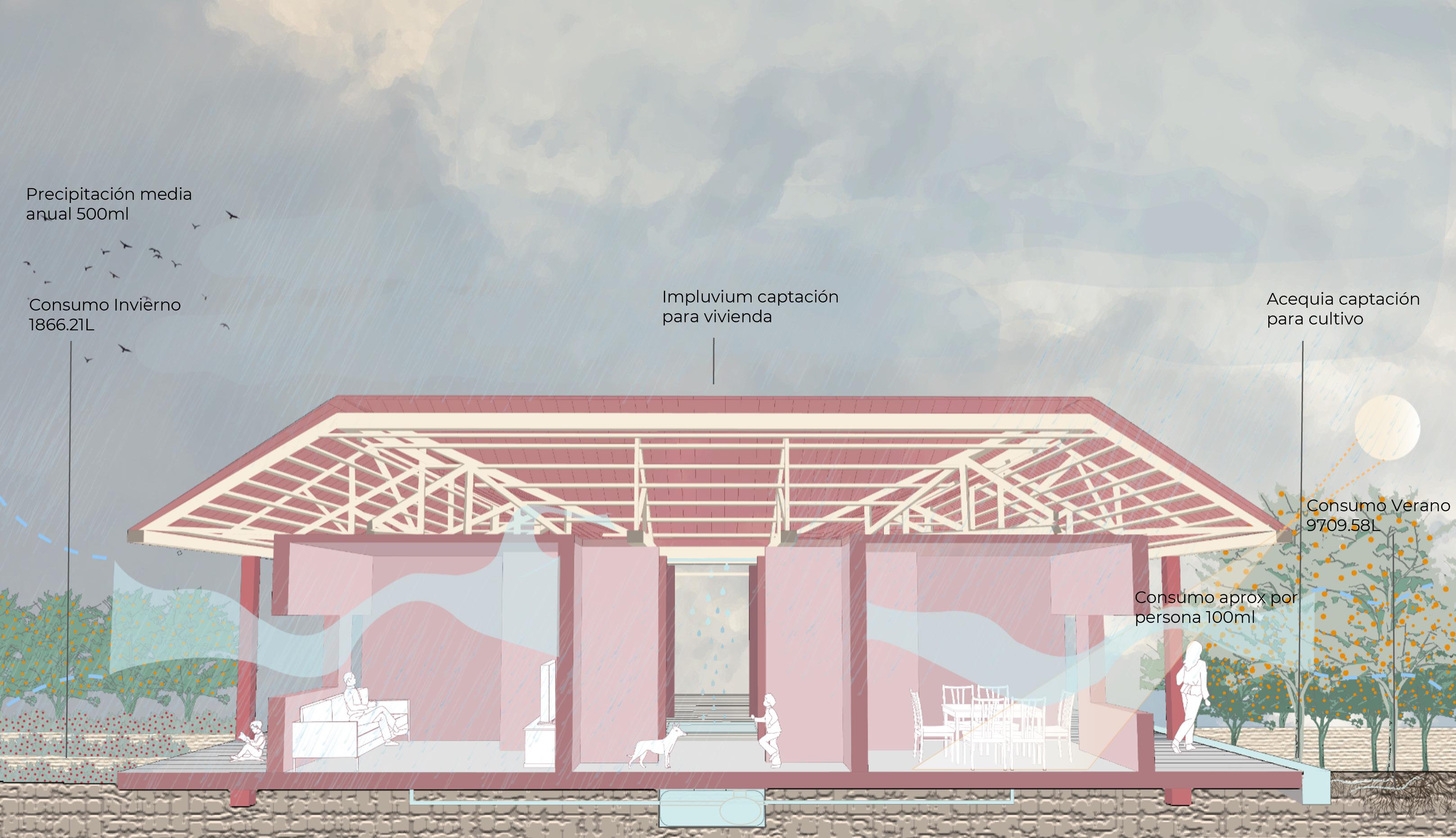Agua y Vivienda Conexión entre viviendas, implementación de impluvium y acequias para la recoleción de agua.