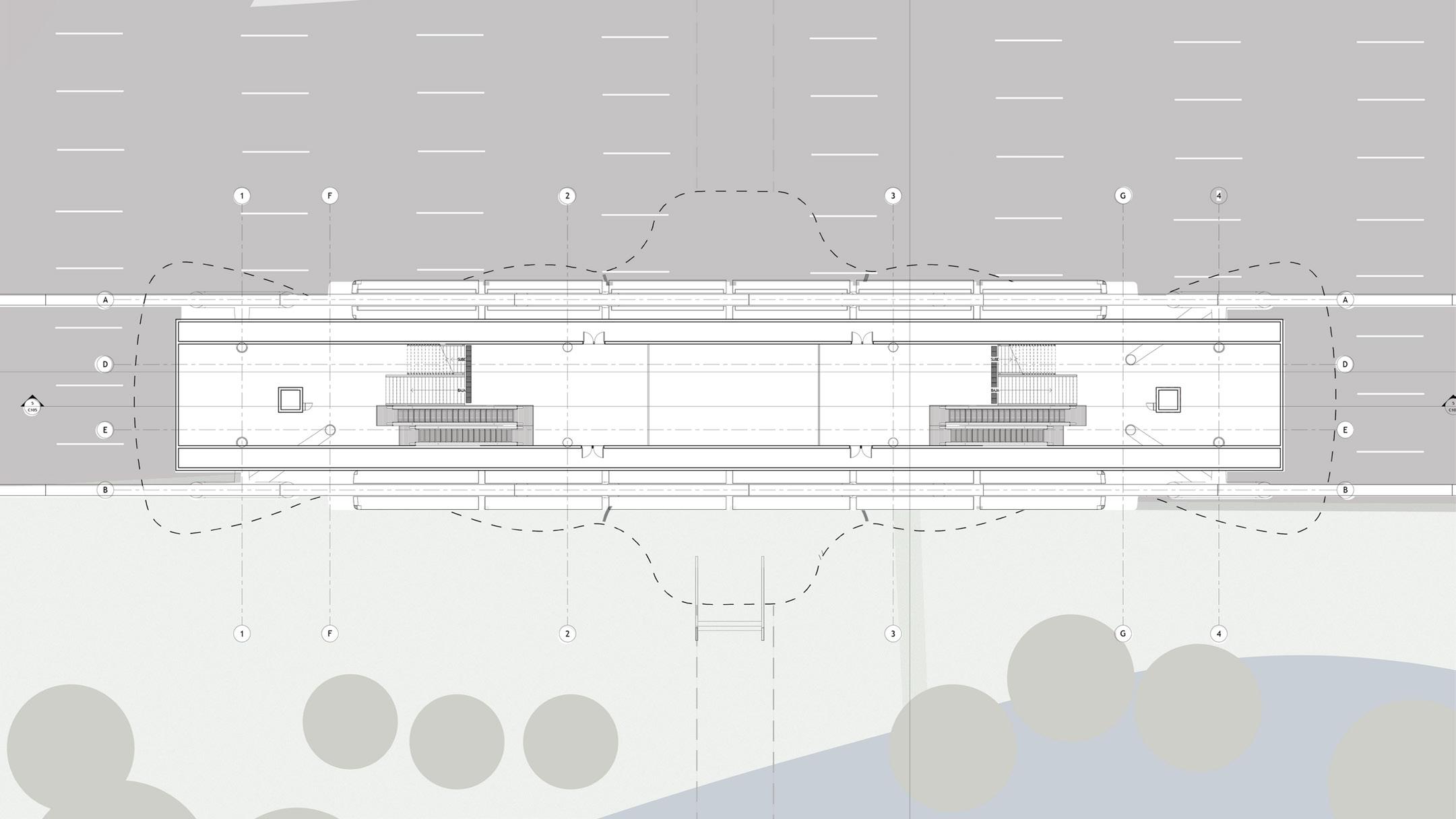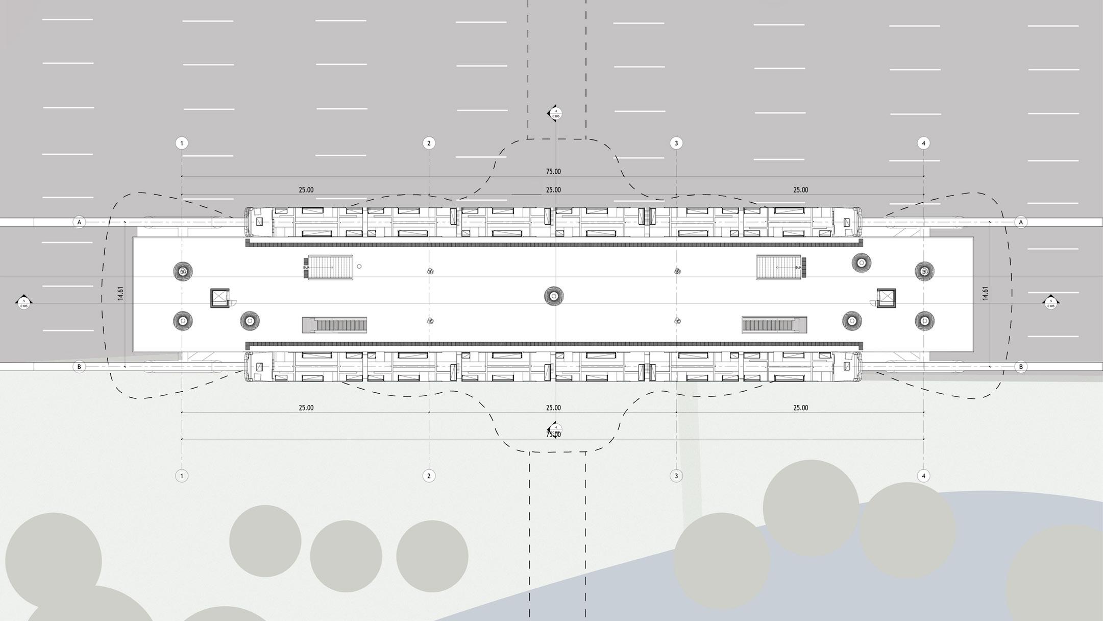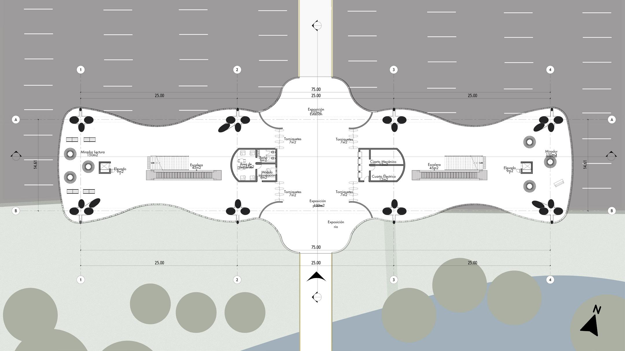 Partiendo desde el actual puente del papa, se coloca un lobby de acceso que se integra al mismo, desde el cual, se generan las circulaciones verticales que permiten el acceso al andén principal.