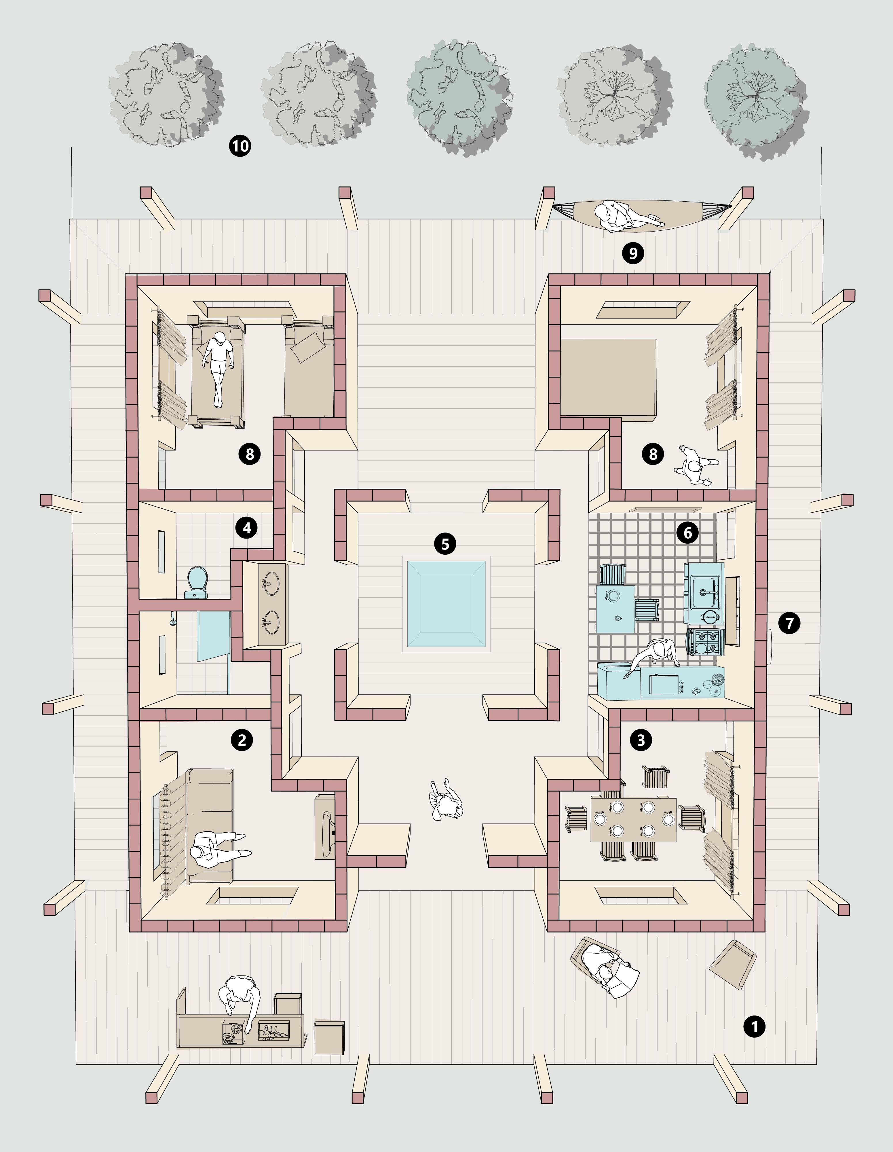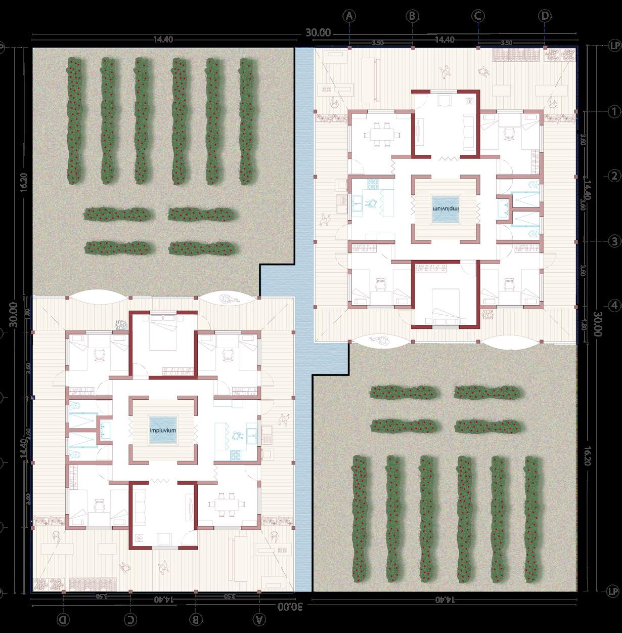 El Ejido Hacienda de Guadalupe, ubicado en el municipio de Linares a 120 minutos de Monterrey, Nuevo Leon, México, se trata de una comunidad rural en la cual se destacan los recursos hídricos, como el Río San Fernando y la presa Cerro Prieto, los cuales en los últimos años han experimentado una sequía, impactando a esta comunidad. Es por esto que se propuso una vivienda modular, tipología de casa patio, en donde se implemente un sistema de captación de agua a través, de un impluvium, asi mismo, pensando en la recuperación de la cultura agrícola en la comunidad, la vivienda contará con un sistema de cultivo que permita a la vivienda ser economicamente activa.