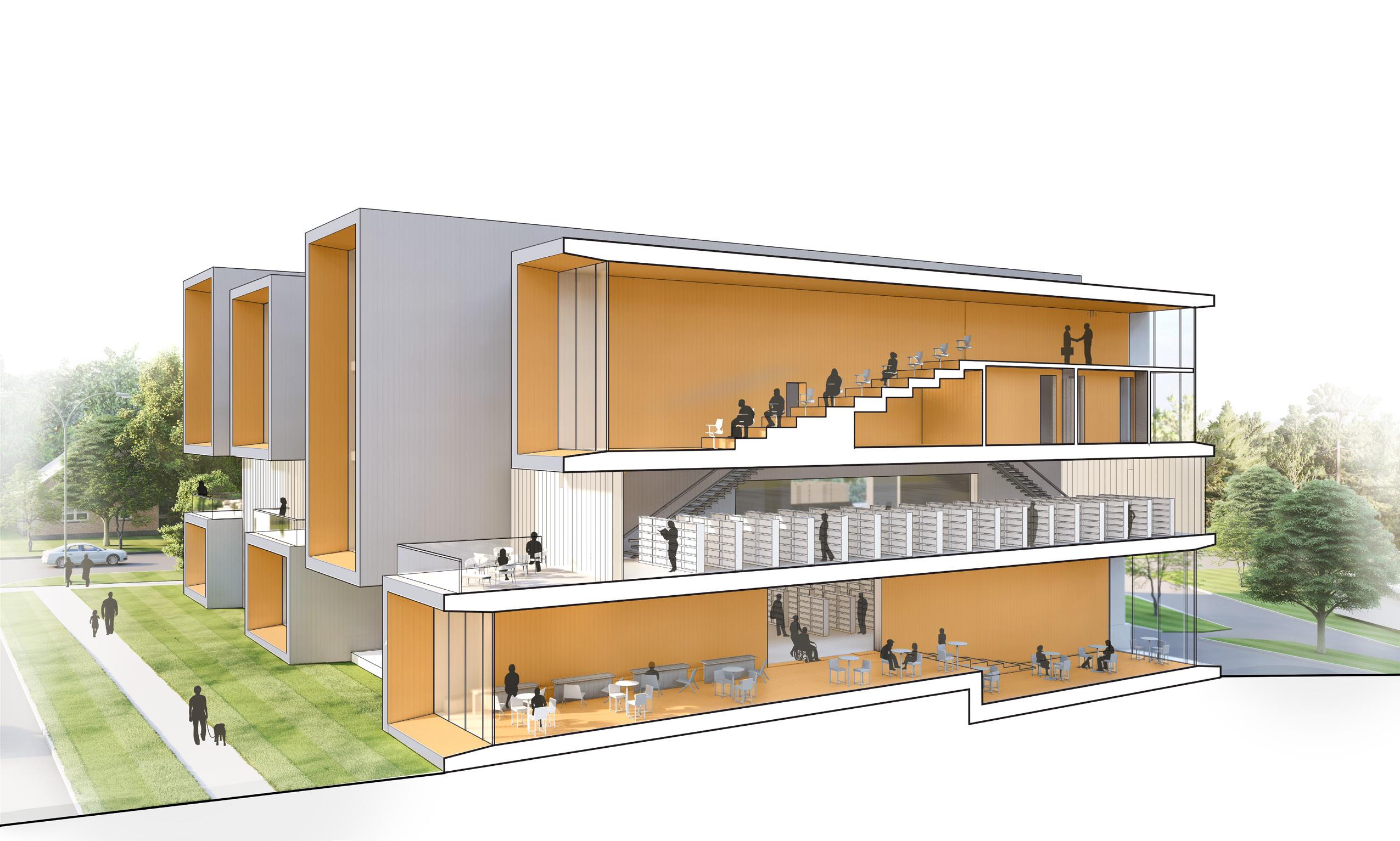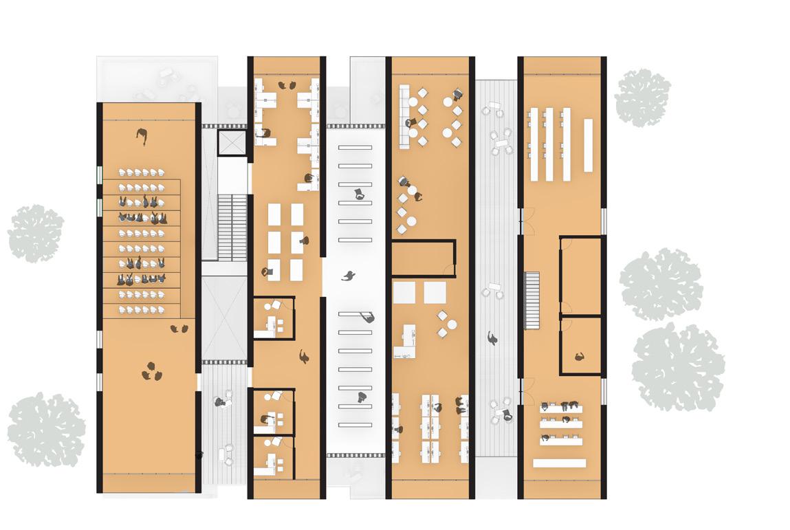 The objective of this project is to create an environment that encourages both the physical and mental exploration of knowledge, driven by curiosity and the desire to learn. The Explorer serves as a place for the Manhattan community to connect with one another on this journey for knowledge. The exploration begins by moving through and around the enclosed programmatic tubes that house the various services offered by the library. The arrangement of these tubes and their openings creates unique adjacencies and offers views outward to the street. The space between the tubes, where the book stacks are located, becomes an area for exploration. In these spaces, views into the tubes spark the curiosity of visitors, offering glimpses of the bright orange glow radiating from the center. Circulation through these areas occurs between two tubes, creating opportunities for interaction with fellow explorers.