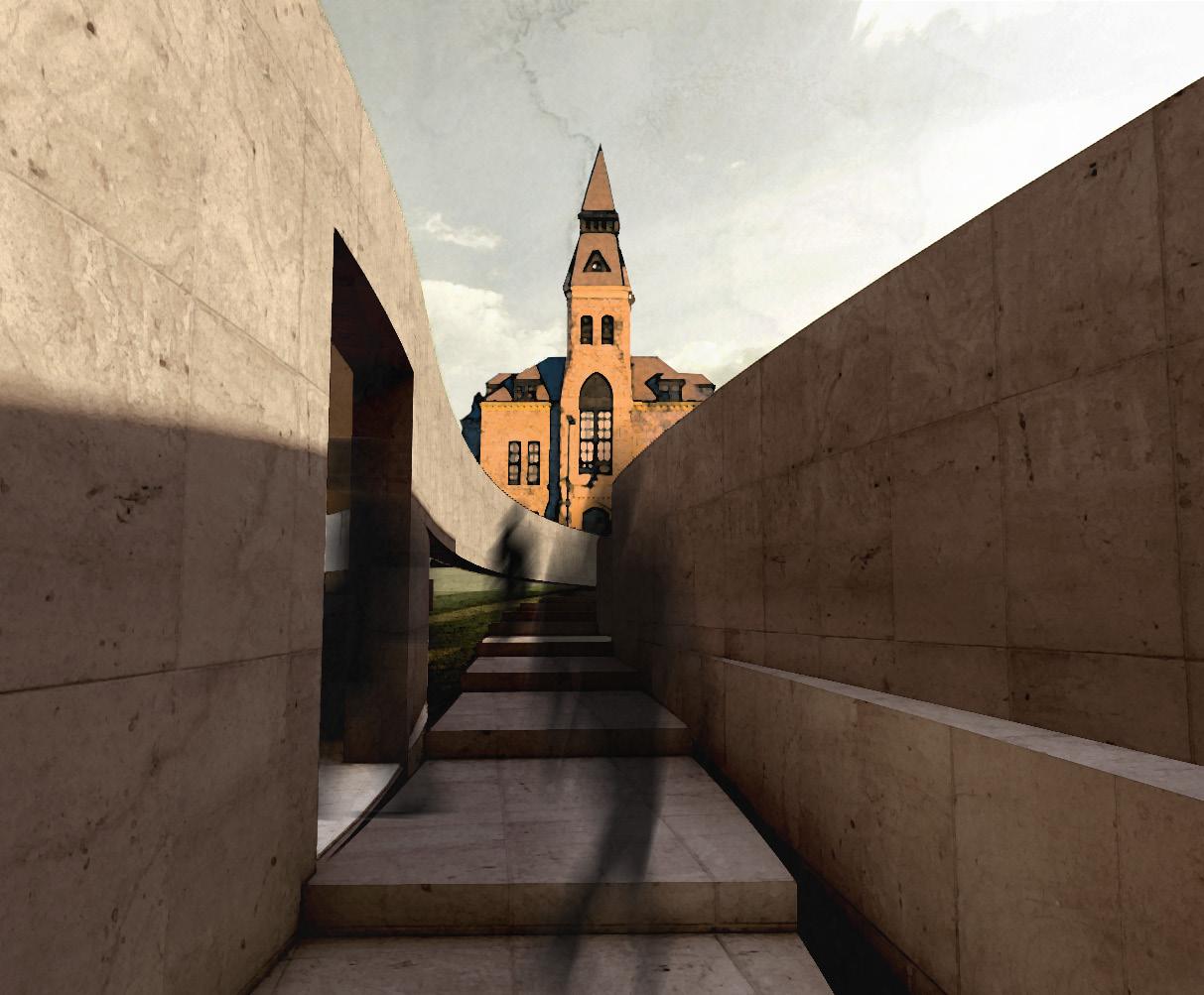 This pavilion is located on Anderson Pavilion, in front of Kansas State University’s flagship building, Anderson Hall. The project serves as a midway point for students walking to class as they enter campus through the lawn. The design is defined by two planes that form the main circulation path into campus. As students follow the pathway, openings on either side reveal a café and an amphitheater. As they ascend the steps, Anderson Hall comes into view over the limestone blocks, guiding them on their journey through campus.