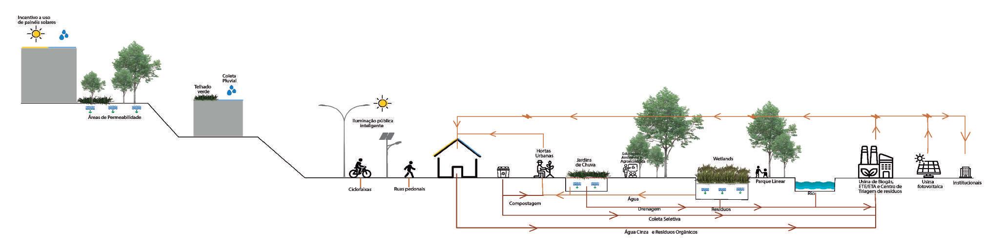 A conexão é a premissa do projeto. A ideia é que os espaços sejam integrativos e comunicativos, que incentivem o convívio social e também o convívio da população com as questões ambientais. O novo bairro será implantado em uma área com características rurais e por isso o projeto busca refletir esses preceitos por meio de iniciati vas sustentáveis, junto a um espaço voltado para a escala do pedes tre. A ideia é um traçado integrativo e orgânico, respeitando a topografia e as condições locais e fomentando na população o sentimento de pertencimento de forma que se sintam conectados ao espaço e colaborem na preservação do meio.