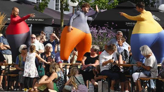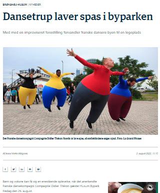 Bedstemorbanden GRANNIES skabte en del angstprovokerende øjeblikke på Danmarks ellers fredelige gader, når de var på flugt efter et uskyldigt æbletyveri fra kiosken. HUG YOU! uddelte hundredvis af kram og kærlighedsøjeblikke, noget som vi har savnet de sidste to coronafyldte år. Publikum fik serveret saftevand fra kæmpestore automater af THE INTERACTIVE BAR, mens THE PERFECT MISTAKE viste noget af verdens bedste og mest sofistikeret jonglering. LA GRANDE PHRASE gjorde igen et stort comeback i deres oppustede ballondragter og justerede deres koreografi mod tyngdekraften i byens mest arkitektoniske byrum. LA BOOM MACHINE var et af de største succeser for både børn og voksne og serverede unik interaktiv underholdning under et anarkistiske kaos. Da forestillingen sluttede med den danske sang ”Der er noget galt i Danmark”, dansede alle i kæde efter de to franske skuespillere og da det hele var slut, kunne ingen finde ord til at beskrive, hvad de havde oplevet. Publikum stod blot begejstret tilbage.