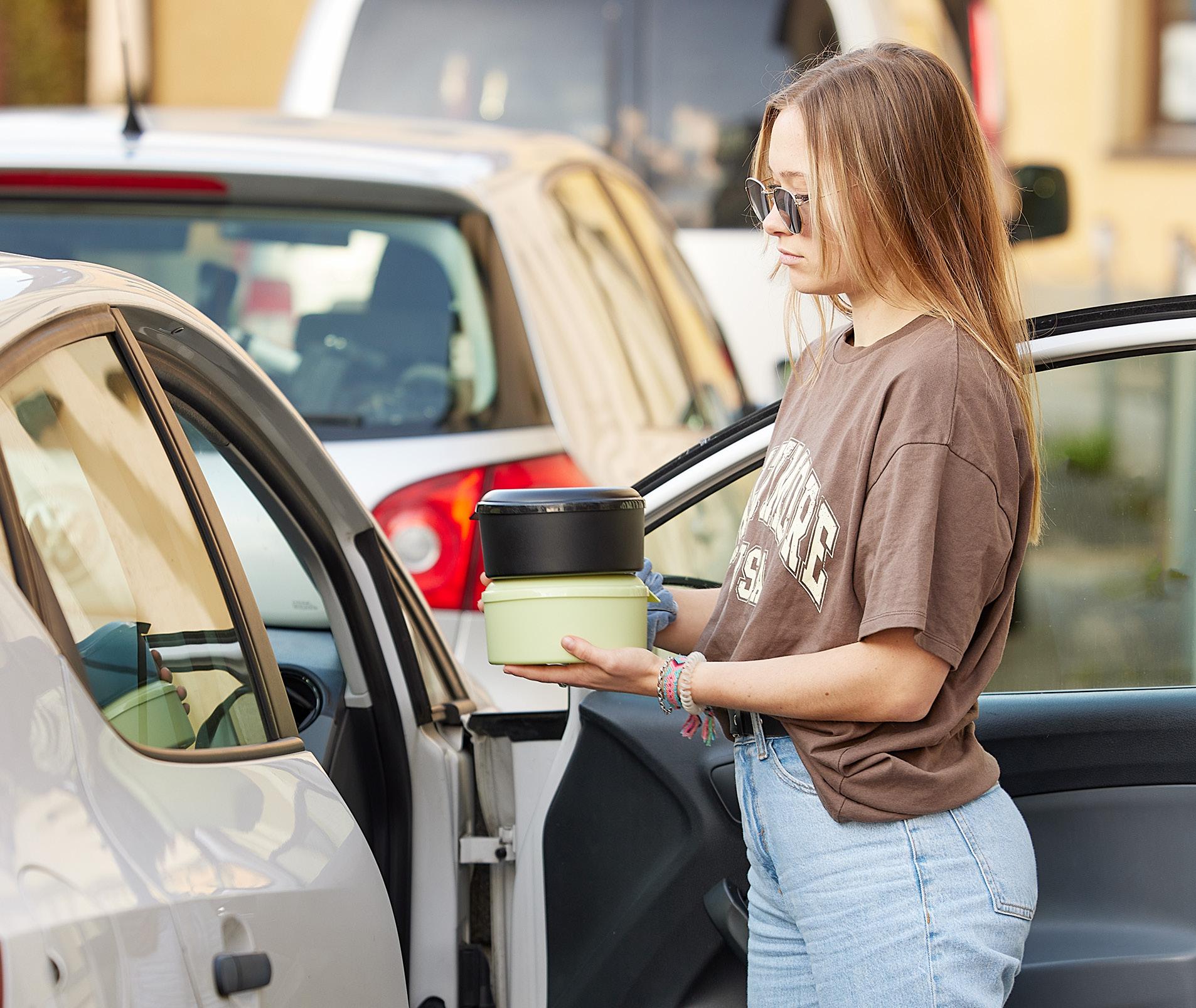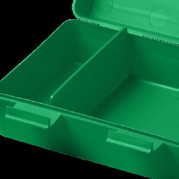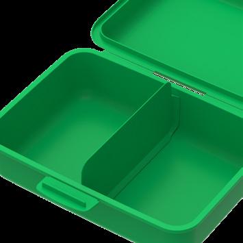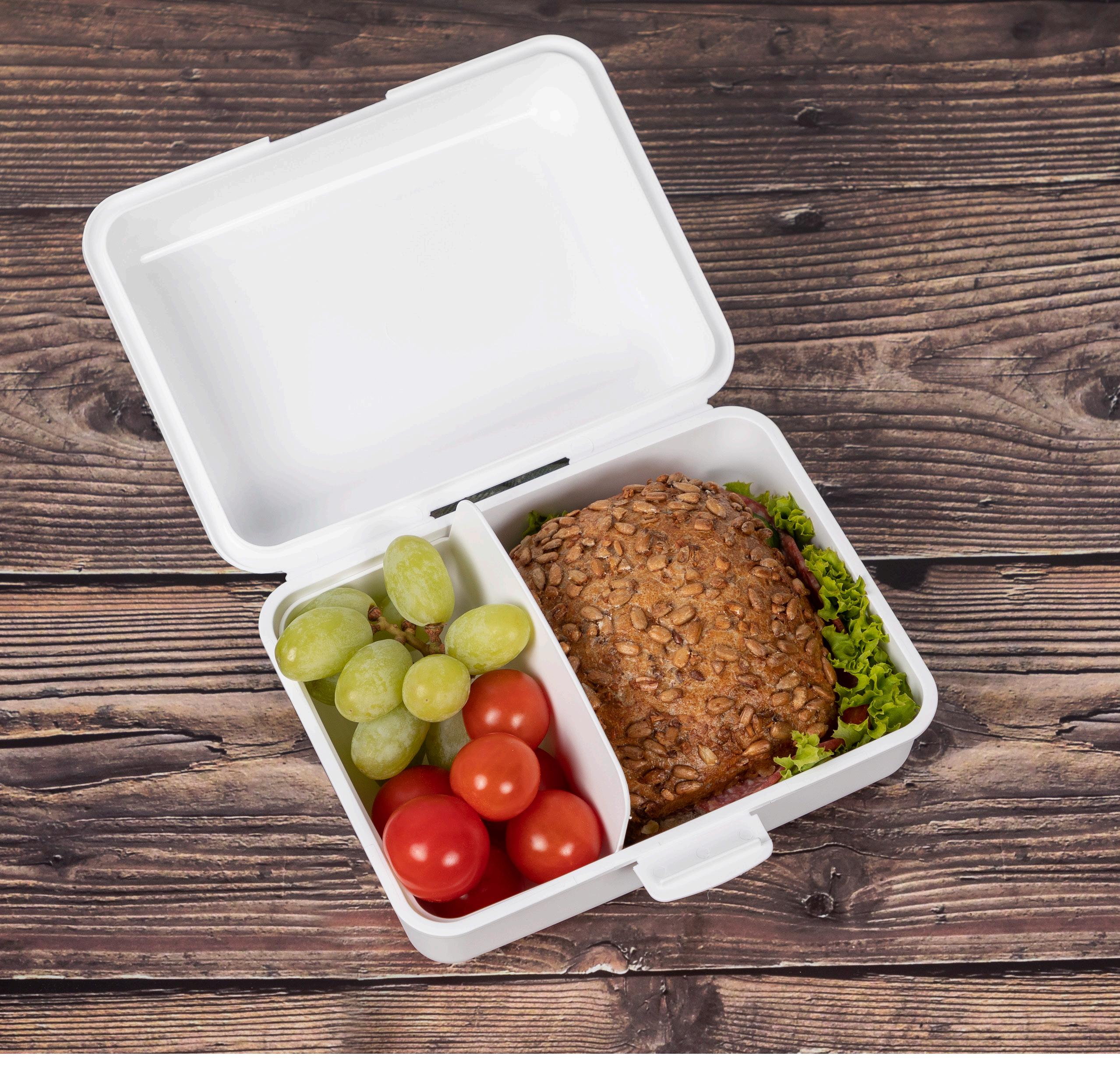 Alles bleibt, wo es hingehört. Geräumige Brotzeitdose mit 2 Klickverschlüssen und herausnehmbarer Wand zum Trennen verschiedener Lebensmittel. IMould-Veredelung möglich.