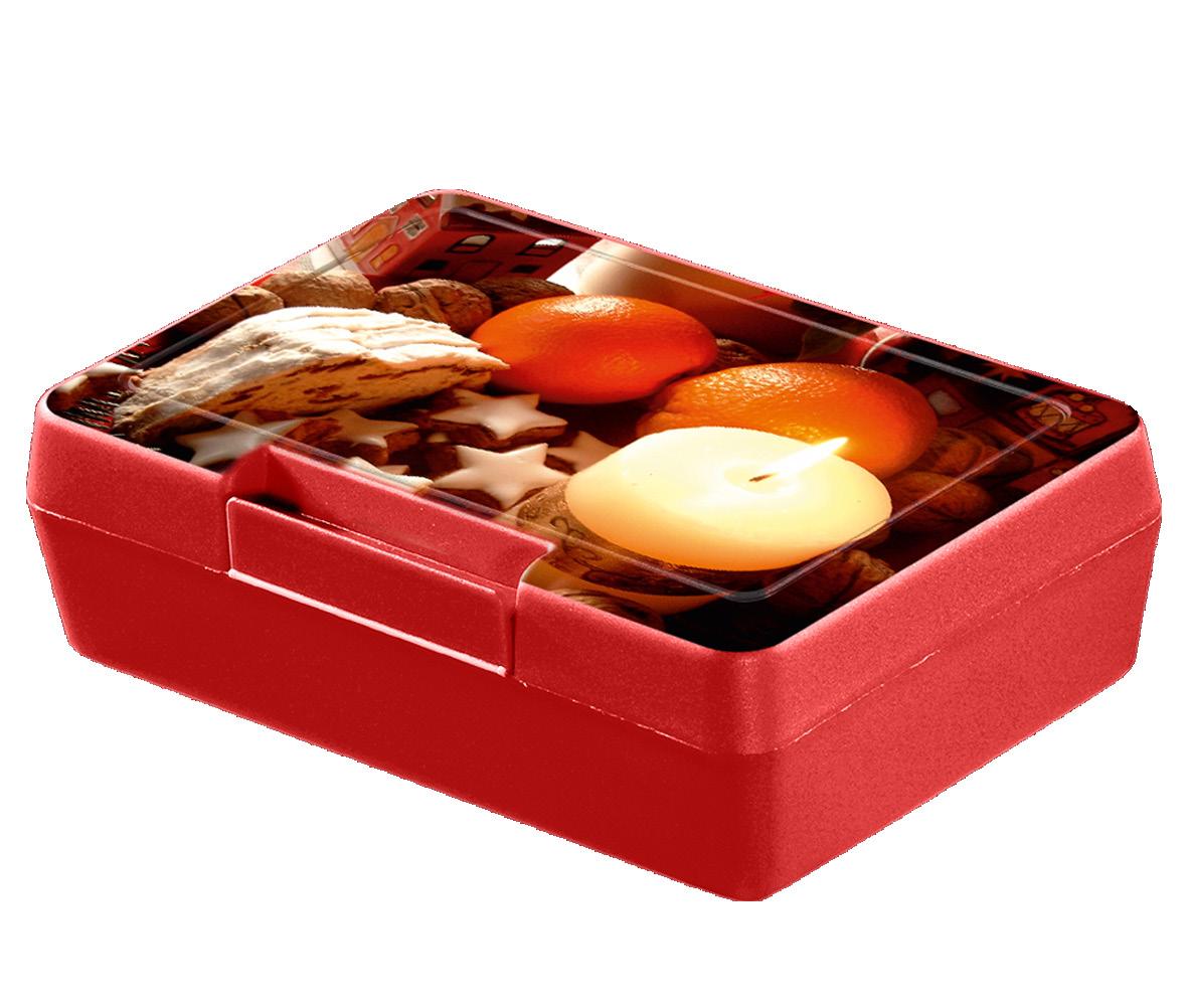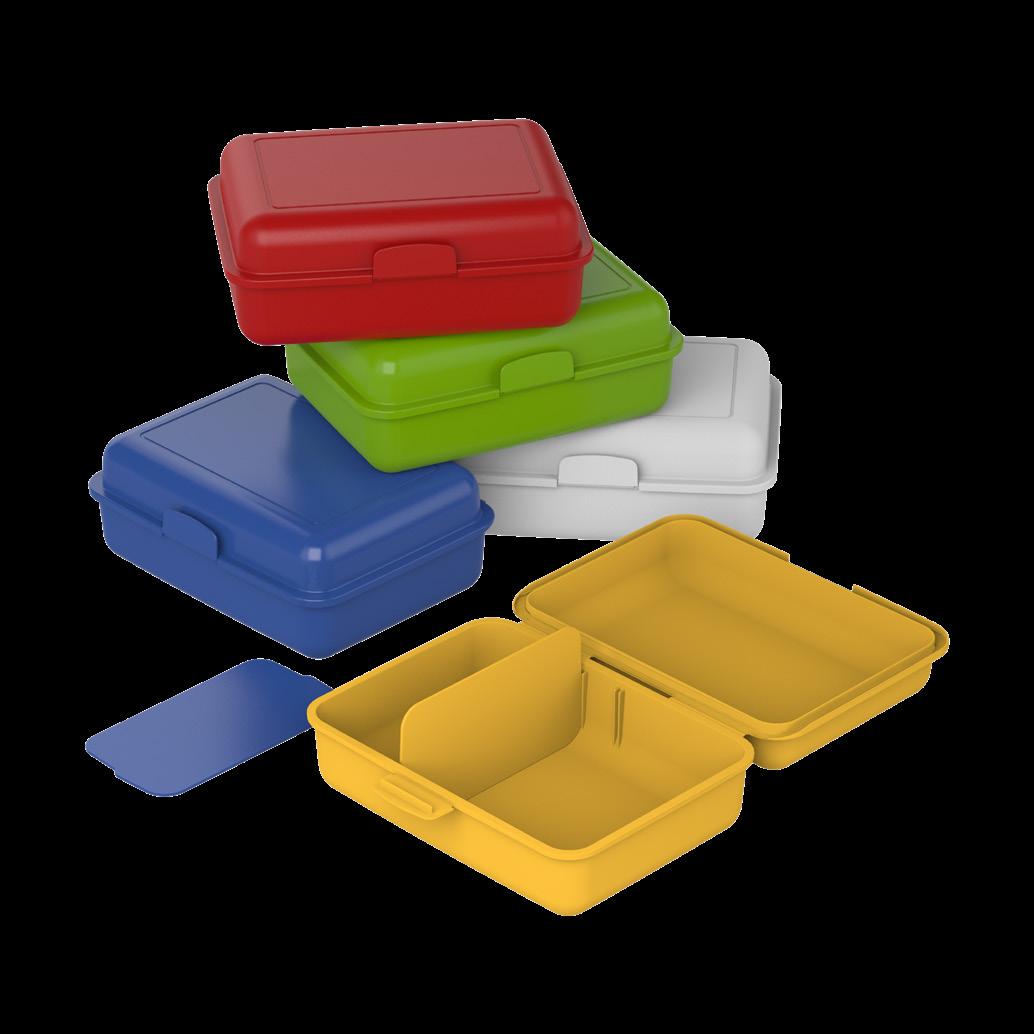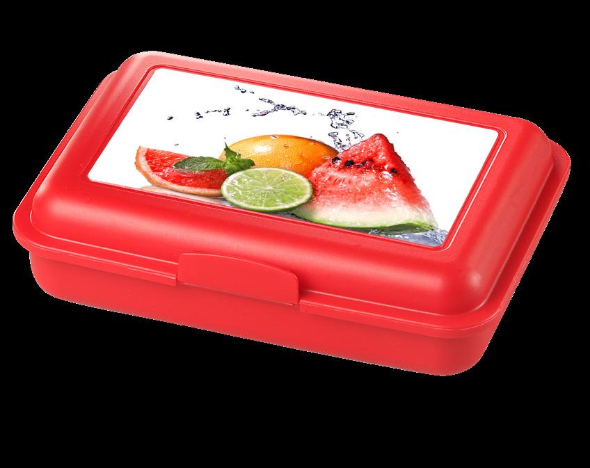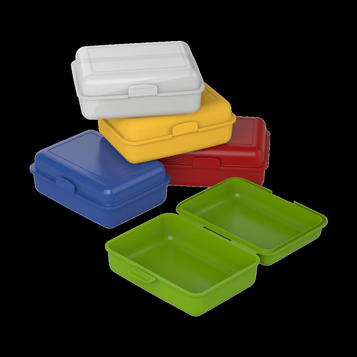 Die ideale Box für das Pausenbrot – mit Klickverschluss sicher verschließbar. In vielen Farben erhältlich und optimal für die Veredelung per IMould-Verfahren geeignet.