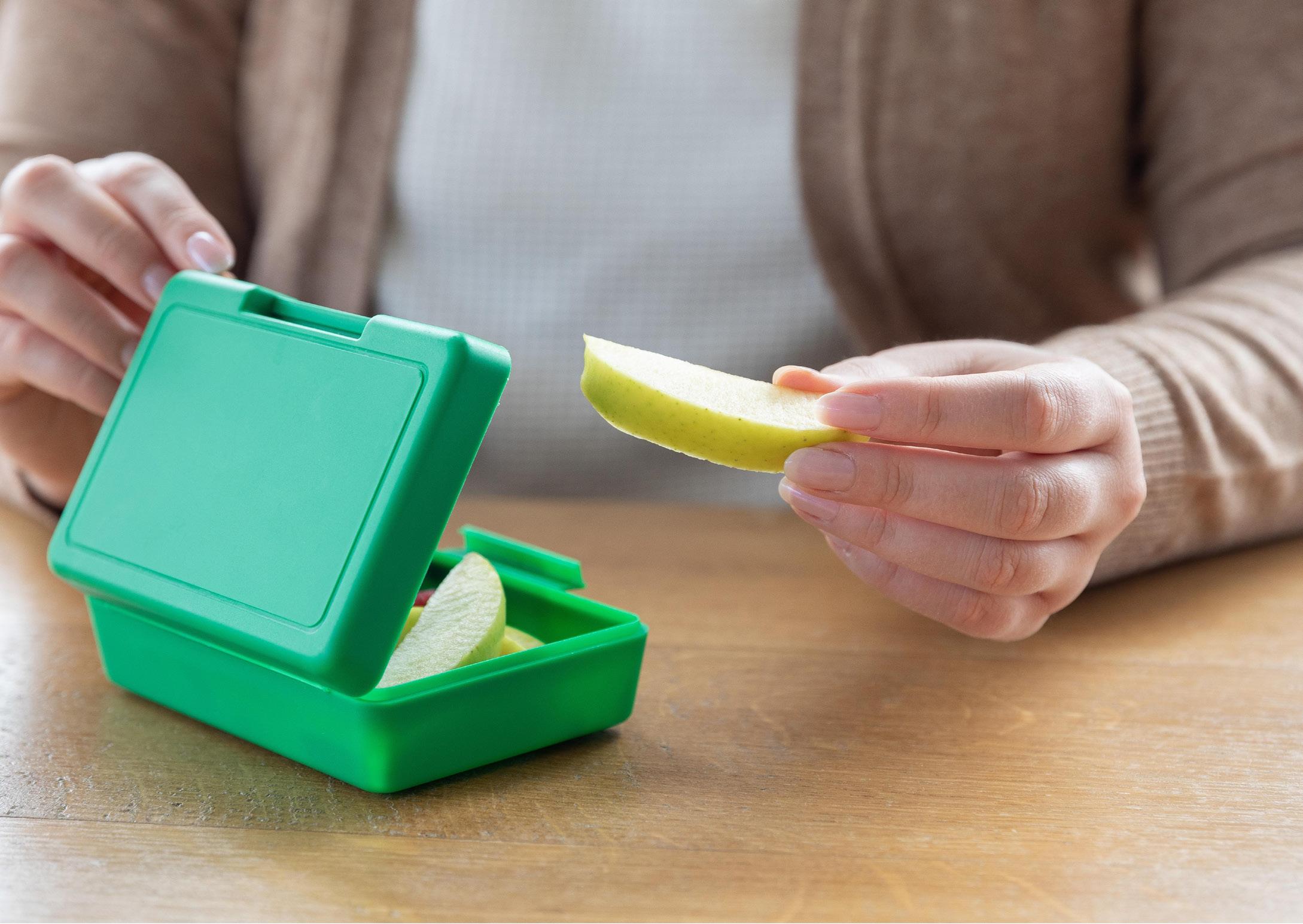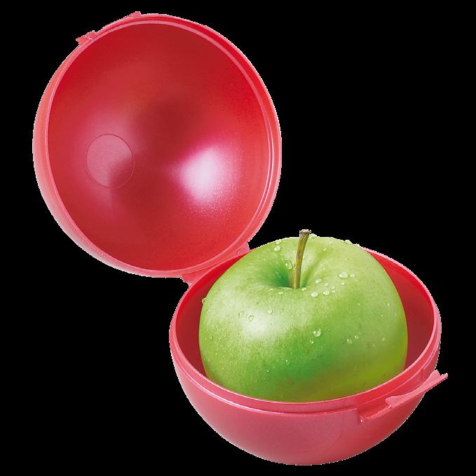 Runde Dose mit Platz für 1 Apfel. Ideal zum Aufbewahren und zum Schutz vor Druckstellen. Mit 1 Klickverschluss.