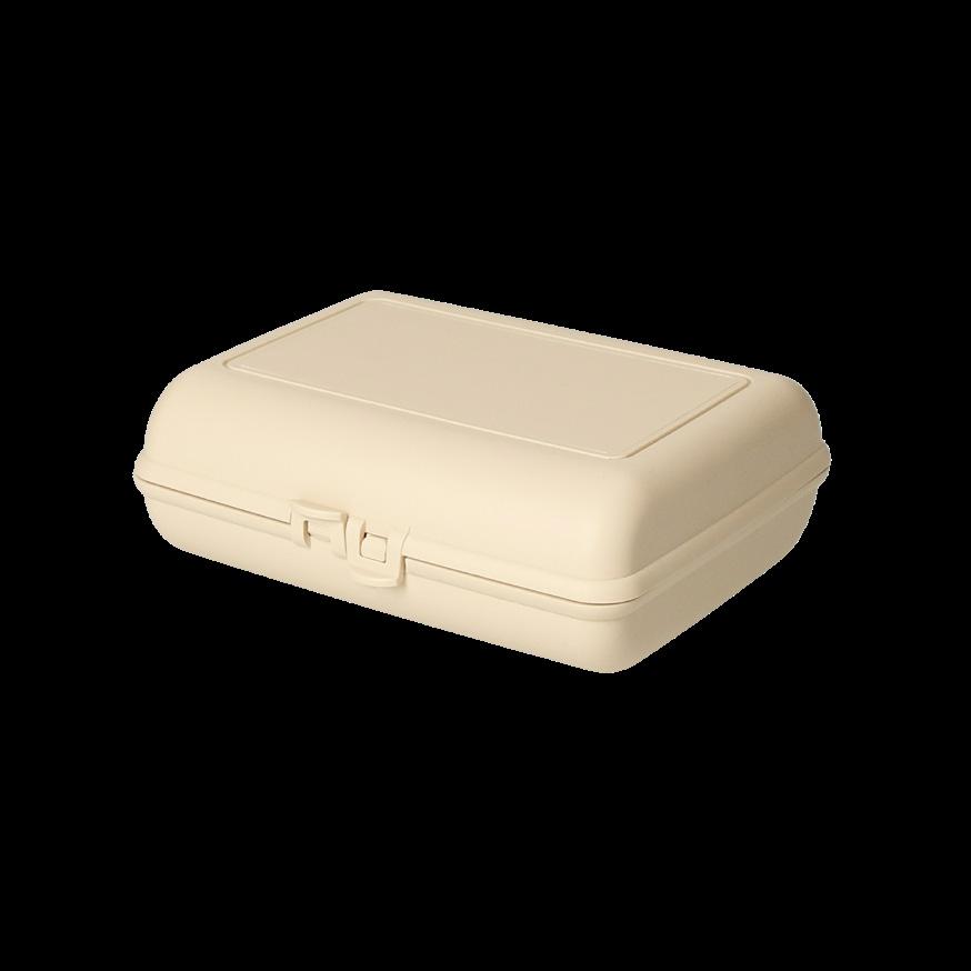Kompakte Brotzeitbox in quadratischem Format mit einem Klickverschluss. Aufgrund der Form und der großzügigen Höhe ideal für Brötchen und Sandwiches. IMould-Veredelung möglich.