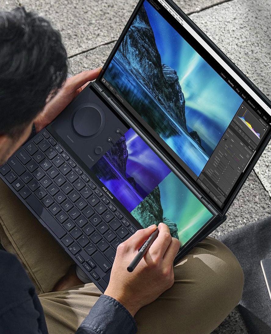 Multitask like a pro with the nextgeneration ScreenPad Plus with AAS Ultra in Zenbook Pro 14 Duo OLED. The 12.7-inch, full-width secondary touchscreen supports the latest highprecision styluses, such as ASUS Pen 2.0, included in the box. This nifty secondary display allows efficient and more comfortable workflow for nittygritty operations, such as image touchups, digital calligraphy, animation, and graphic design. It also allows