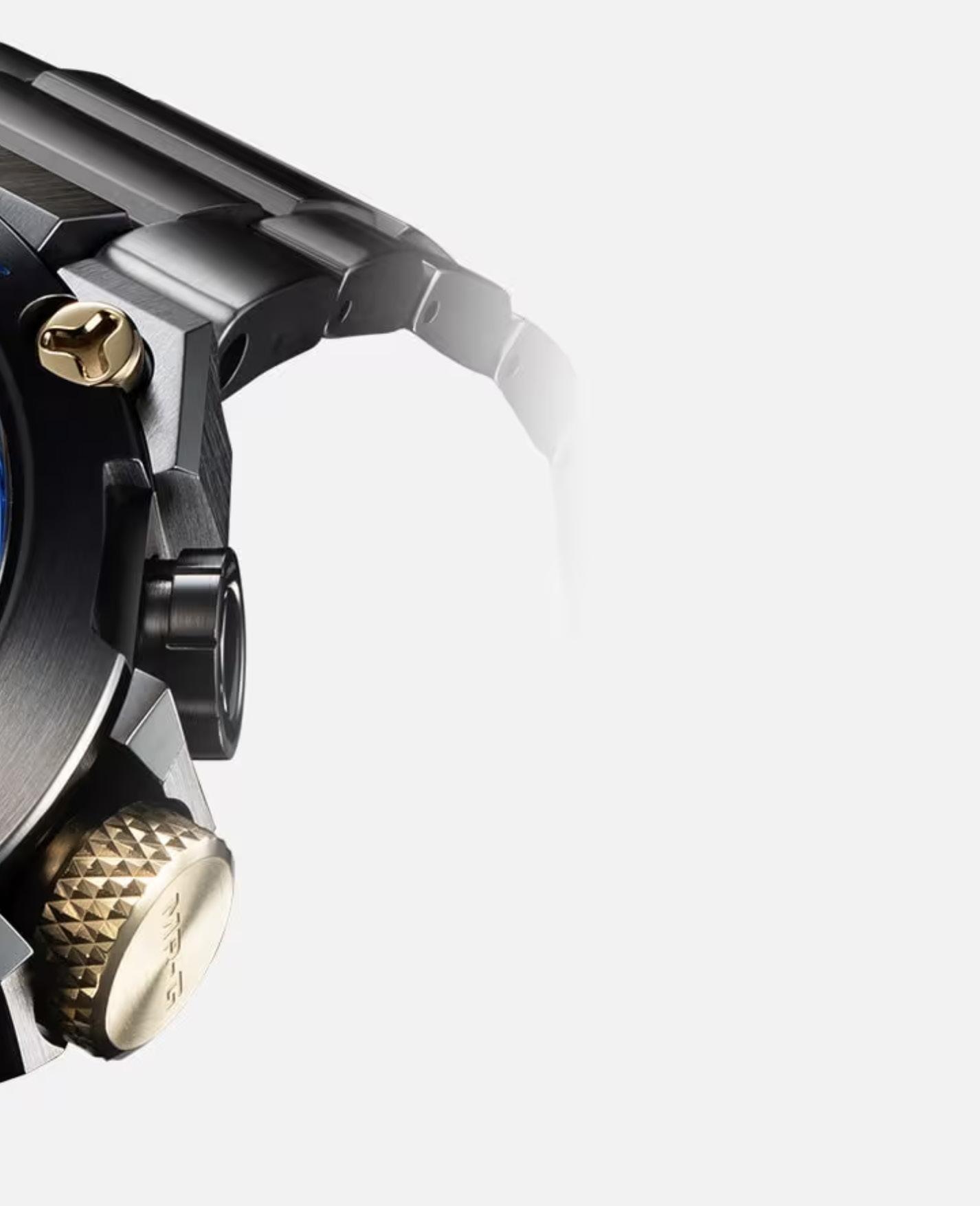 As with finish, various techniques were applied, such as Sallaz Polishing, considered the ultimate in polishing techniques among highly skilled artisans. This is executed to achieve mirror finishes of flawless beauty on the surface of the titanium. A deep-layer of hardening process creates a coating four to five times harder than pure titanium on the surface while a further DLC coating serves to enhance scratch resistance. Likewise, its defined grind mark finish is possible with the state-of-the-art nano processing by YAMAGATA Casio. The special shape is created with high-precision die molding with a meticulously detailed finish.