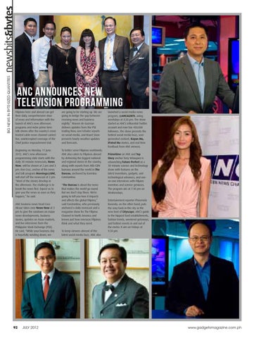 launched a social media news program, @ANCALERTS, airing weekdays at 4:30 pm. The show started as ANC’s influential Twitter account and now has 450,000 followers. The show presents the hottest social media buzz, usergenerated content, Bayan Mo, iPatrol Mo stories, and real time feedback from ANC viewers. Primetime on ANC and Top Story anchor Tony Velasquez is relaunching Future Perfect as a 30-minute science and technology show with features on the latest inventions, gadgets, and technological advances, and oneon-one interviews with Filipino inventors and science geniuses. The program airs at 7:30 pm on Wednesdays. Entertainment reporter Phoemela Baranda, on the other hand, puts the sexy back in the city as the new host of Cityscape, ANC’s guide to the hippest food establishments, fashion trends, weekend getaways, and hottest events in and out of the metro. It airs on Fridays at 9:30 pm.